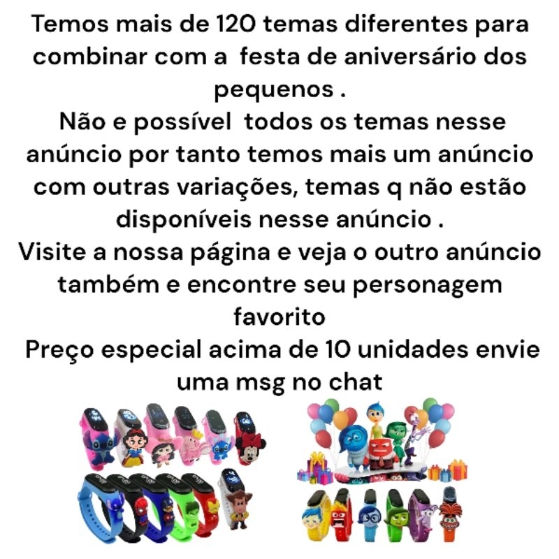 ATENÇÃO VENDEMOS ATACADO / ACIMA DE 10 UNIDADES PREÇO ESPECIAL ATACDO CONSULTENOS PELO CHAT TEMOS A QUANTIDADE DESEJADA Relógio Infantil Temático Patrulha Canina - Digital e à Prova d'Água Este relógio digital infantil é a escolha perfeita para os pequenos fãs da Patrulha Canina! Com um design colorido e vibrante, inspirado nos heróis caninos, ele traz diversão e praticidade ao dia a dia das crianças. Além de ser resistente à água, o que garante mais durabilidade e segurança, é ideal para usar durante festas de aniversário, brincadeiras e atividades ao ar livre. Perfeito para presentear ou como lembrancinha em festas temáticas, esse relógio combina estilo e funcionalidade, permitindo que a criança acompanhe as horas de forma divertida e prática. Não deixe de incluir esse item incrível na sua próxima festa ou no presente para aquela criança especial!