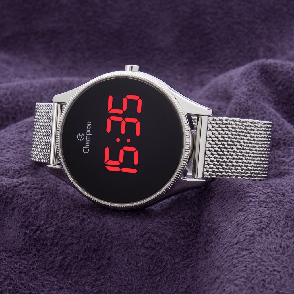 Relógio Digital Prata Champion Led Vermelho Pulseira Esteira Mesh CH40133T Original
