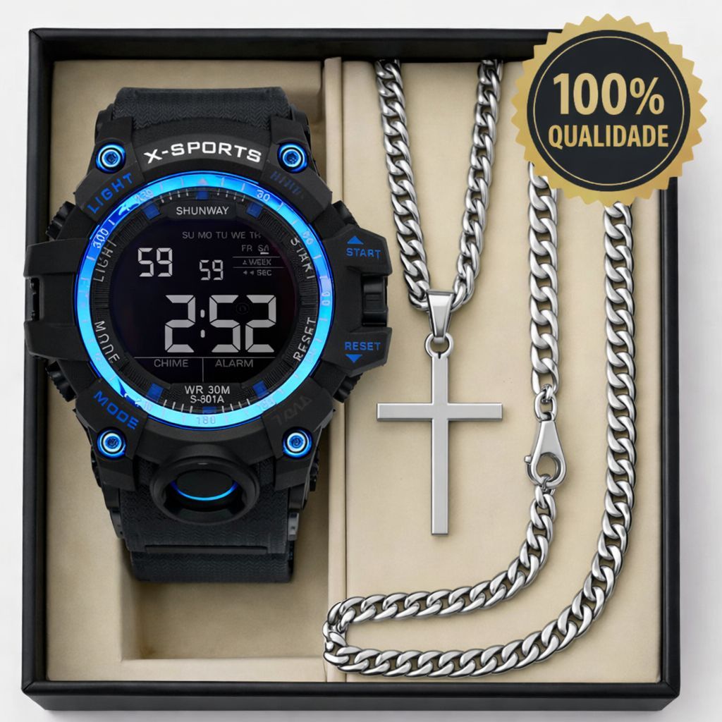 Relógio Esportivo A Prova d'Água C Shok + Corrente Banhada a Prata Ouro + Pulseira Premium Promoção
