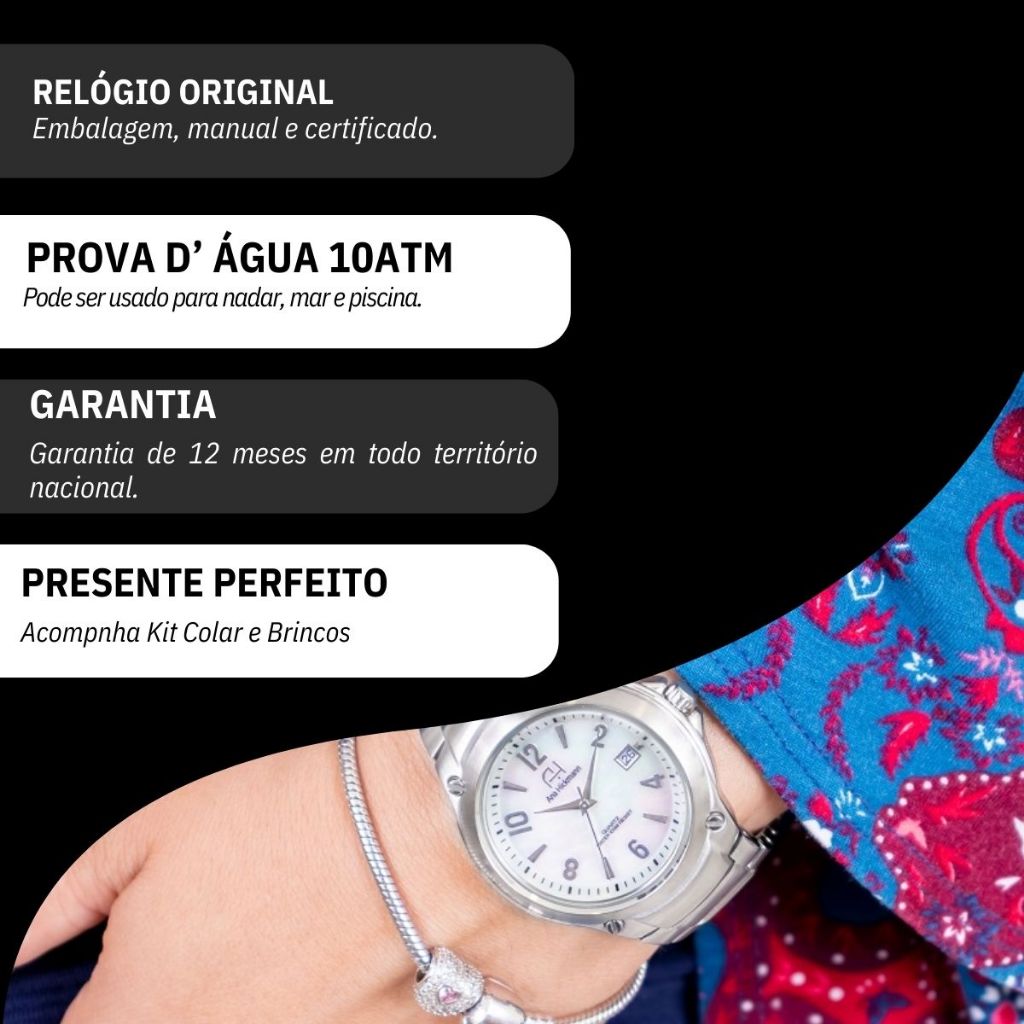Quer conhecer as melhores marcas de relógios com os melhores preços? Seja bem-vindo à RBM WEBSHOP - Aqui você encontra relógios originais, que acompanham a caixa, nota fiscal e a garantia de um ano do fabricante. Abaixo colocamos algumas informações como o tamanho, a cor, as especificações sobre resistência à água, o material do relógio e todo o necessário. Após a confirmação do pagamento, nós prepararemos o seu pacote em uma embalagem segura e lacrada, e você receberá o código de rastreamento. Ah, e depois você pode avaliar tanto nossa loja como o produto, pois a sua opinião é muito importante para melhorar cada vez mais nossos serviços! Seja bem-vindo sempre e sinta-se seguro. Esse é nosso compromisso! RBM WEBSHOP RELÓGIOS DO BRASIL Loja Autorizada VAMOS CONHECER MELHOR O RELÓGIO? Informações Básicas: Marca: Ana Hickmann Referência: AH30237Q Gênero: Feminino Características: Composição do Vidro: Cristal Mineral Material da Caixa: Aço Inox Cor da Caixa: Prata Material da Pulseira: Aço Inox Cor da Pulseira: Prata Tipo de Fundo: Rosqueado Cor do Fundo: Madre Peróla Modelo : Analógico Mecanismo: Quartz Alimentação: Bateria Resistência à Água: 10 ATM Diâmetro da Caixa: 3,9 cm Espessura da Caixa: 1,3 cm Largura da Pulseira: 1,8 cm Comprimento da Pulseira: 21 cm Peso: 139 gramas Tipo de Fecho:Dobrável com dois botões Funções Especiais: Calendário ***Brinde Kit Colar e Brincos iguais as fotos.*** Relógio de altíssima qualidade, com 1 ano de garantia. Conteúdo da Embalagem O relógio vai na caixa original, com a nota fiscal, certificado de garantia e manual de instrução. Acompanha um kit colar e brincos de presente.