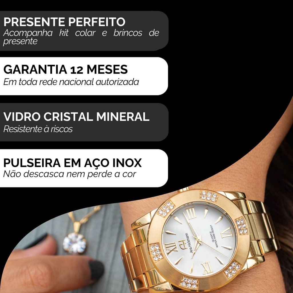 Relógio Feminino Champion Ana Hickmann Dourado Analógico Prova D'Água AH28740H Kit Colar e Brincos