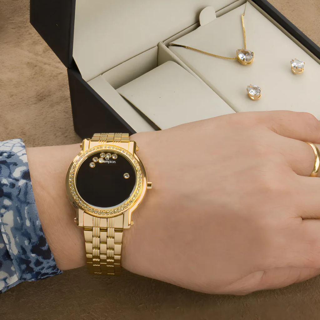 Relógio Feminino Champion Dourado Com Strass Digital Kit Colar e Brincos CH48055H
