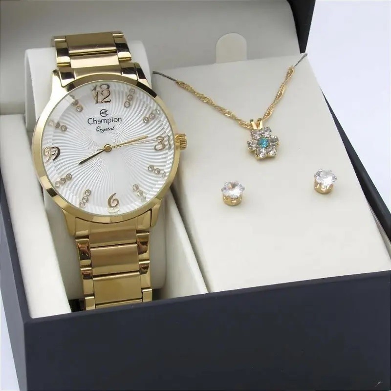 Relógio Feminino Champion Dourado Kit com Colar e Brincos Original CN25556W