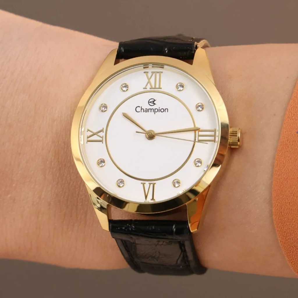 Relógio Feminino Champion CN28268B – Estilo Social com Toque Clássico | Dourado com Pulseira Preta de Couro Destaques: -Design social elegante com contraste sofisticado entre dourado e preto -Caixa dourada de 36 mm com mostrador branco, leitura clara e visual orgânico -Pulseira em couro preto: leveza, conforto e elegância no uso -Ideal para agradecimento formais ou para dar um toque de aula ao dia a dia -Acabamento clássico com detalhes modernos que valorizam qualquer visual Detalhes: -Marca: Champion -Modelo: CN28268B -Gênero: Feminino -Tipo de exibição: Analógico -Formato da caixa: Redondo -Largura da caixa: 36 mm -Espessura da caixa: 9 mm -Material da caixa: Metal com banho dourado -Cor da caixa: Dourado -Cor do mostrador: Branco -Pulseira: Couro sintético -Cor da pulseira: Preto -Comprimento da pulseira: 150 mm -Tipo de fecho: Fivela tradicional -Estilo: Social -Garantia: 12 meses pelo fabricante Embalagem e Garantia: -Acompanha estojo original Champion -Garantia de 1 ano contra defeitos de fabricação Sugestão de uso: Uma excelente escolha para o ambiente corporativo, eventos formais ou jantares especiais. Combine facilmente com trajes sociais ou casuais elegantes. Toque emocional: O Relógio Champion CN28268B é uma união perfeita entre sobriedade e elegância. Um acessório que transmite confiança e bom gosto — ideal para mulheres que valorizam a sofisticação nos detalhes.