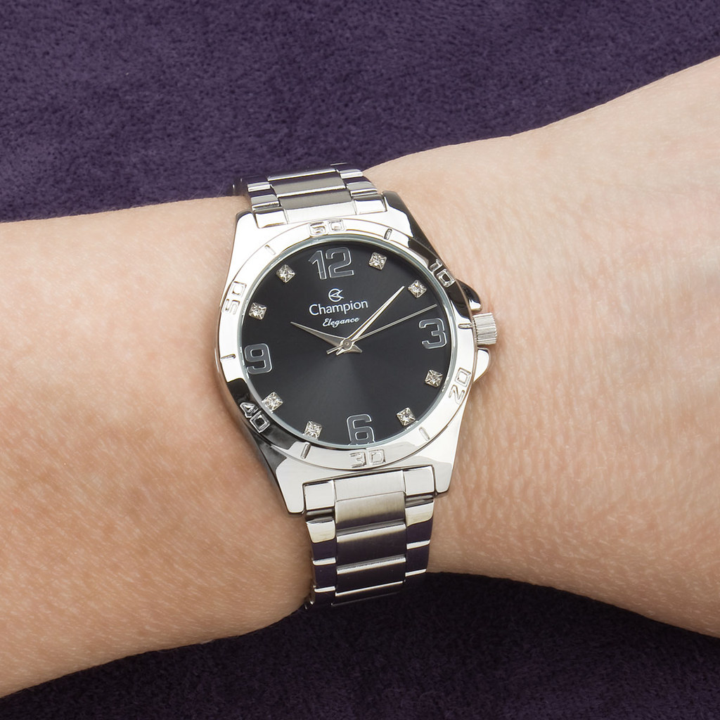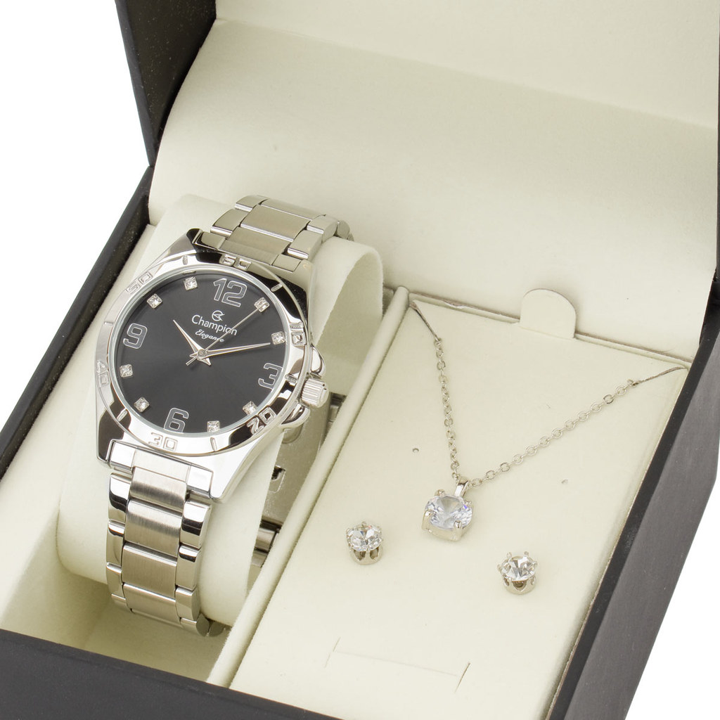 Relógio Feminino Champion Prata Fundo Preto Kit Colar e Brincos CN28446P