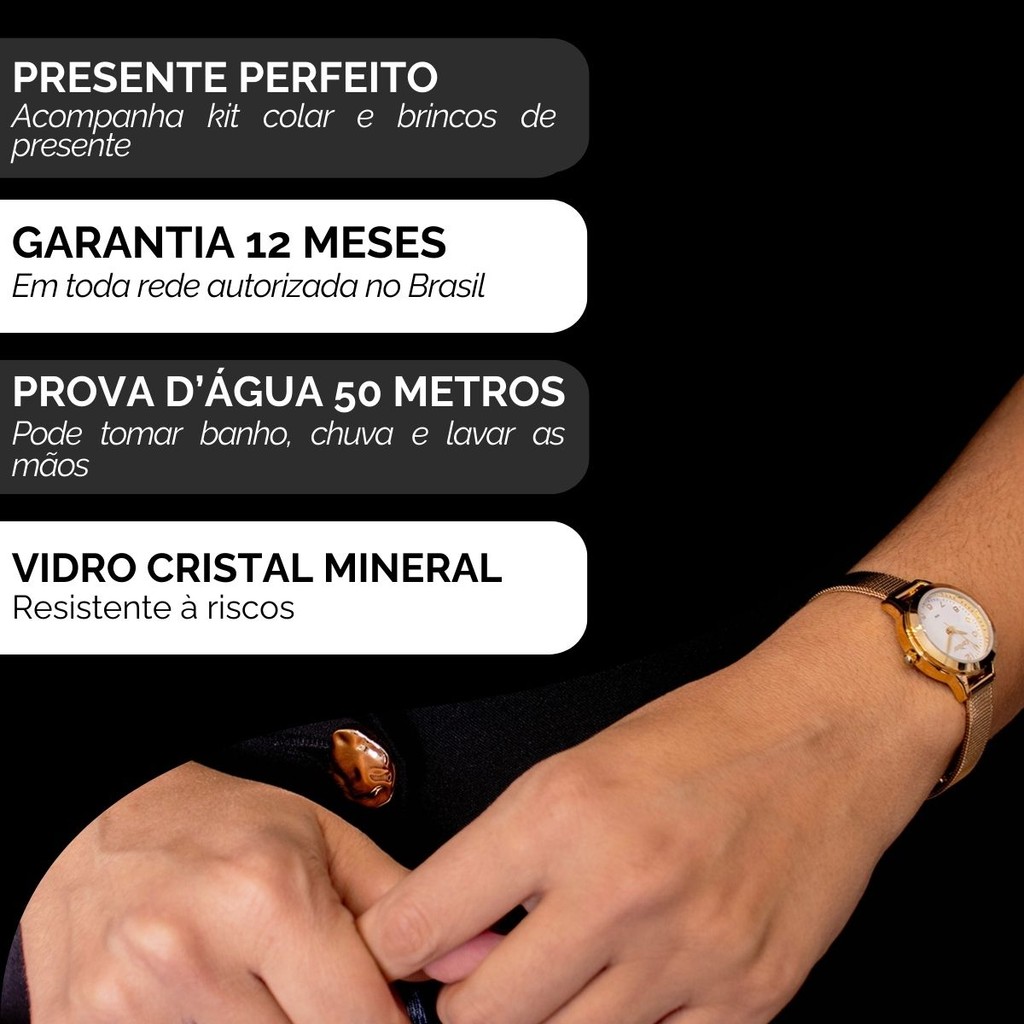 Você está procurando um relógio analógico feminino pequeno para acompanhar o seu dia a dia? Seja bem vindo à RBM WEBSHOP - todos os nossos relógios são originais e a pronta entrega para envio imediato. Veja as PRINCIPAIS CARACTERÍSTICAS do Relógio Feminino Condor Dourado Informações Básicas Marca: Condor Modelo: CO2035MZS/K4K Gênero: Feminino Resistência à Água: 5atm – 50mts: Pode ser usado para nadar, praticar esportes e lavar as mãos Medidas do Relógio Tamanho (diâmetro): 2,5 (PEQUENO) Circunferência da pulseira e tamanho máximo de ajuste de punho: 19 cm Espessura: 1,0 cm Largura da Pulseira: 1,0 cm Peso: 31 gramas Materiais do Relógio Composição do Vidro: Cristal Mineral (RESISTENTE A RISCOS) Material da Caixa: Metal Material da Pulseira: Aço Inox Material da Tampa: Aço Inox Características do Relógio Mecanismo: Analógico Alimentação: Bateria Duração aproximada da bateria: 2 anos Fecho: Fecho Gancho (Hook Buckle) Tampa Posterior: Pressão Cores Mostrador: Branco Caixa: Dourado Pulseira: Dourado Garantia 1 ano de garantia em todo território nacional com a rede autorizada Conteúdo da Embalagem Este produto acompanha Manual em Português e Nota Fiscal, Kit Colar e Brincos, Embalagem de Fabrica Original e Garantia Nacional do Fabricante. VAMOS CONHECER MELHOR SOBRE A LOJA RBM WEBSHOP RELOGIOS? Somos uma das melhores e maiores lojas de relogios no Brasil. Todos os relógios vendidos pela nossa loja são 100% originais, contém nota fiscal, certificado, manual de instruções e garantia de 12 meses com a rede de assistência em todo o Brasil. Dúvidas? Pergunte, e será um enorme prazer lhe atender!