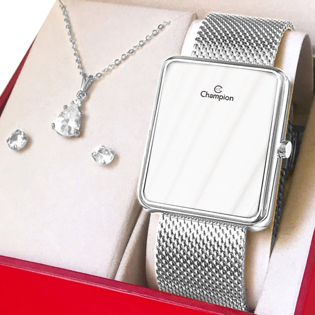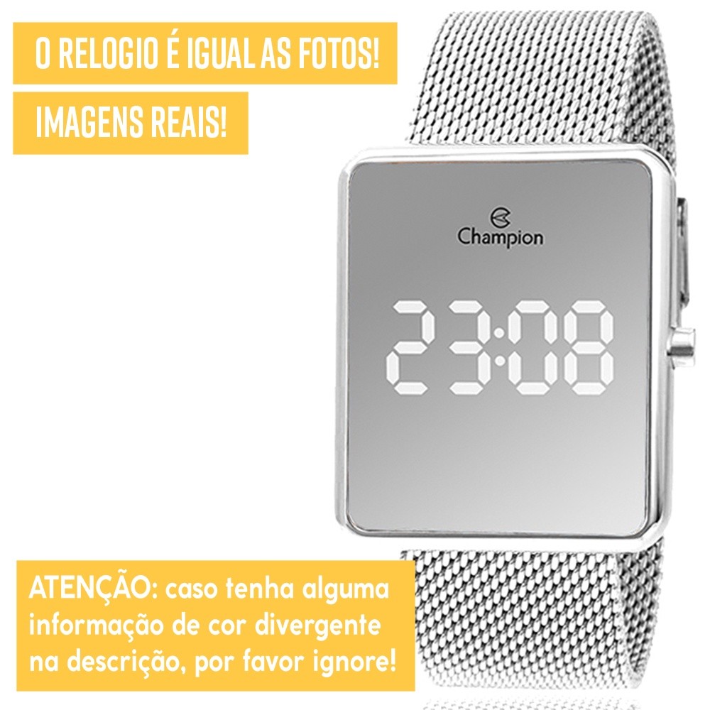 Oi! Tá procurando aquele presente perfeito? Encontrou! Dê o lindo kit Champion de presente para você mesmo, ou para alguém querido! Os relógios digitais estão em alta e combinam com tudo, sem contar que esse modelo tem a tela totalmente espelhada, então também serve como espelho portátil. Top! E aqui na loja LEBRAVE você vai encontrar somente produtos originais e com nota fiscal. Se ficar com dúvidas, leve o relógio em algum especialista da sua região para comprovar :) Ah, e tome cuidado com os anúncios falsificados por ai! O Relógio Champion Digital Original com Vidro Espelhado: - Tem 1 ano de garantia de fábrica e 30 dias de garantia da loja - É resistente à água (por exemplo: você pode lavar as mãos, lavar louças e tomar chuva) - Tem a tela totalmente espelhada - Tem a tela feita com cristal mineral (é mais resistente contra riscos!) - A tela é em LED (isso garante maior definição na imagem) - Tem bateria com longa vida útil - É feito todo em aço inoxidável - Tem calendário - E tem a pulseira totalmente ajustável por um fecho, ou seja, você pode ajustar em casa! Agora vamos falar do tamanho do seu Relógio: Largura do mostrador: 3,6 cm (36 mm) Altura do mostrador: 4,2 cm (42 mm) Largura da pulseira: 2,1 cm (21 mm) Ou seja, esse relógio tem um tamanho médio. É uma medida que fica perfeita na maioria dos pulsos femininos, tem um tamanho respeitável, mas sem nenhum exagero. E não tem nenhum risco de não servir bem, pois a pulseira é totalmente ajustável. A sua embalagem vai acompanhar: 1 Relógio Champion, 1 conjunto de colar e brincos, 1 caixa de luxo original Champion, 1 manual de instruções/certificado de garantia. E lembre-se! Caso não tenha gostado ou simplesmente se arrependeu, devolva o produto sem preocupações. Você tem 30 dias a partir do recebimento para devolvê-lo se precisar!