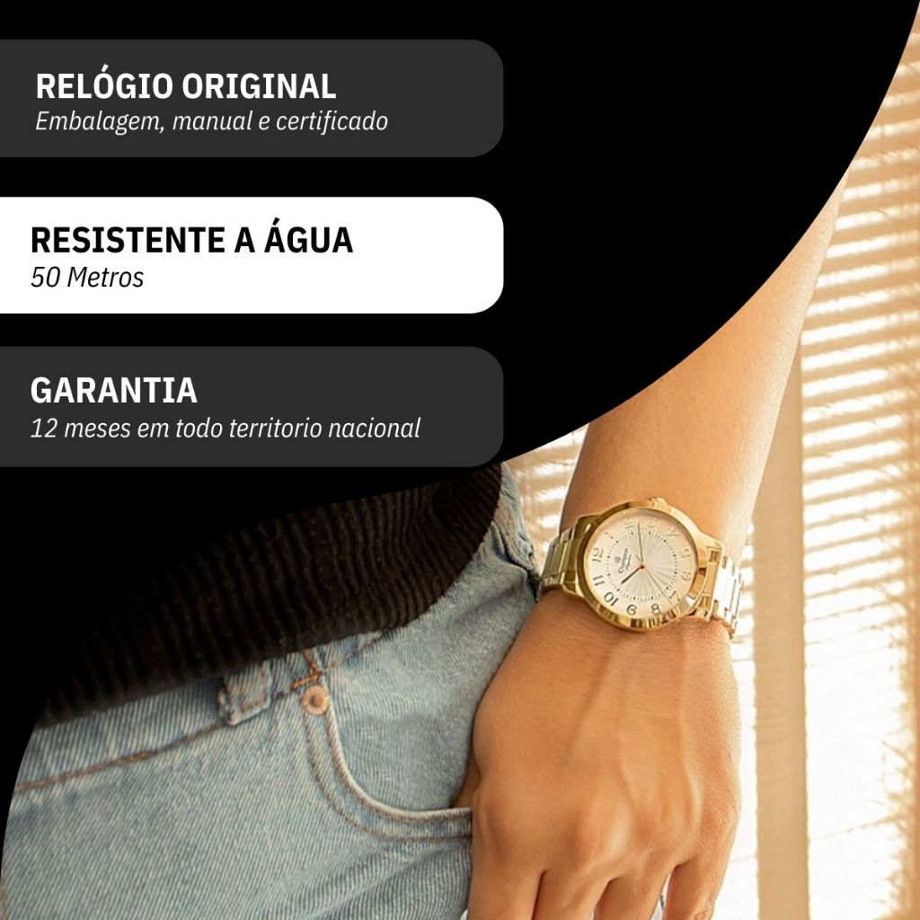 Você está procurando um relógio analógico feminino elegante e sofisticado para acompanhar o seu dia a dia? Seja bem vindo à RBM WEBSHOP - todos os nossos relogios são originais e a pronta entrega para envio imediato. Veja as PRINCIPAIS CARACTERÍSTICAS do Relógio Feminino Champion Dourado Informações Básicas Marca: Champion Modelo: CN25118W Gênero: Feminino Resistência à Água: 5atm – 50mts: Pode ser usado para nadar, praticar esportes e lavar as mãos Medidas do Relógio Tamanho (DIÂMETRO): 4,0 cm (MÉDIO) Espessura: 1 cm Largura da Pulseira: 2 cm Circunferência da Pulseira: 20 cm Peso: 90 gramas Materiais do Relógio Composição do Vidro: Cristal Mineral (RESISTENTE A RISCOS) Material da Caixa: Metal Material da Pulseira: Aço Inox Material da Tampa: Aço Inox Características do Relógio Mecanismo: Quartz Alimentação: Bateria com vida útil 2 anos Fecho: De abotoar, com trava e dois botões Fundo: Rosca Cores Mostrador: Branco Caixa: Dourada Pulseira: Dourada Garantia: 1 ano de garantia em todo território nacional com a rede autorizada Conteúdo da Embalagem O relógio vai na caixa original, kit colar e brincos, com a nota fiscal, certificado de garantia e manual de instrução. VAMOS CONHECER MELHOR SOBRE A LOJA RBM WEBSHOP RELOGIOS? Somos uma das melhores e maiores lojas de relogios no Brasil. Todos os relógios vendidos pela nossa loja são 100% originais, contém nota fiscal, certificado, manual de instruções e garantia de 12 meses com a rede de assistência em todo o Brasil. Dúvidas? Pergunte, e será um enorme prazer lhe atender!