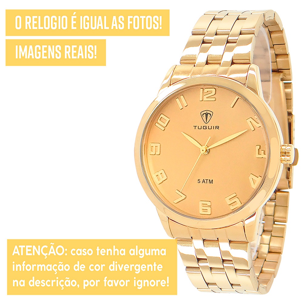 Bem vindo! Procurando um presente perfeito? Encontrou! Dê o lindo kit Tuguir de presente para você mesmo, ou para alguém querido! 1 ANO DE GARANTIA TUGUIR - Produto com NOTA FISCAL *ACOMPANHA CONJUNTO DE COLAR E BRINCOS* Atuamos somente com produtos 100% ORIGINAIS! Leve em um especialista de sua região para comprovar. Ficha Técnica: Prova D'água: Sim - selo de resistência 5 ATM Material do vidro: Cristal mineral resistente a riscos Maquinário: Cristal quartzo - bateria Material do relógio: Liga de aço Cor da tela: Dourado Medidas: Tamanho da caixa: (mostrador): 3,9 cm (39 mm) Espessura: (mostrador): 1,1 cm (11 mm) Largura da pulseira: 1,8 cm (18 mm) Circunferência da pulseira : 26 cm (pode ser diminuída para servir em todo tipo de pulso) Acompanha Relógio Tuguir, caixa original Tuguir, colar, brincos, manual de instruções em português, certificado de garantia e nota fiscal. Nossos produtos são todos tratados com máximo cuidado, profissionalismo e atenção. Enviamos o seu relógio em uma embalagem reforçada, protegida por dentro e por fora. Caso não tenha gostado ou simplesmente se arrependeu, devolva o produto sem preocupações. Você tem 30 dias a partir do recebimento para devolvê-lo. COMPRE COM SEGURANÇA Revendedor autorizado Tuguir