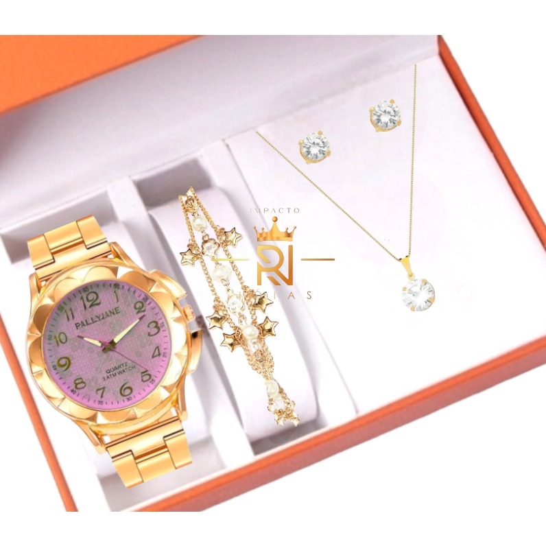 Relógio Feminino + Kit Colar Brincos e Pulseira Folheados
