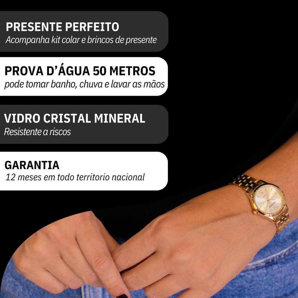 Você está procurando um relógio analógico para acompanhar o seu dia a dia? Seja bem vindo à RBM WEBSHOP - todos os nossos relógios são originais e a pronta entrega para envio imediato. Veja as PRINCIPAIS CARACTERÍSTICAS do Relógio Feminino Analógico Dourado Mondaine Informações Básicas Marca: Mondaine Modelo: 32606LPMKDE1K4 Gênero: Feminino Resistência à Água: 5atm – 50mts: Pode ser usado para nadar, praticar esportes e lavar as mãos Medidas do Relógio Tamanho (DIÂMETRO): 2,8 cm (PEQUENO) Circunferência da pulseira e tamanho máximo de ajuste de punho: 18 cm Espessura: 0,9 cm Largura da Pulseira: 1,2 cm Peso: 53 gramas Materiais do Relógio Composição do Vidro: Cristal Mineral (RESISTENTE A RISCOS) Material da Caixa: Metal Material da Pulseira: Aço Inox Material da Tampa: Aço Inox Características do Relógio Mecanismo: Analógico Alimentação: Bateria Duração aproximada da bateria: 2 anos Fecho: Fecho Dobrável com Botão (Folding Clasp with Push-Button) Tampa Posterior: Rosca Cores Mostrador: Dourado Caixa: Dourado Pulseira: Dourado Garantia 1 ano de garantia em todo território nacional com a rede autorizada Conteúdo da Embalagem Este produto acompanha Manual em Português, nota Fiscal, colar e brincos, Embalagem de Fabrica Original e Garantia Nacional do Fabricante. VAMOS CONHECER MELHOR SOBRE A LOJA RBM WEBSHOP RELOGIOS? Somos uma das melhores e maiores lojas de relógios no Brasil. Todos os relógios vendidos pela nossa loja são 100% originais, contém nota fiscal, certificado, manual de instruções e garantia de 12 meses com a rede de assistência em todo o Brasil. Dúvidas? Pergunte, e será um enorme prazer lhe atender!