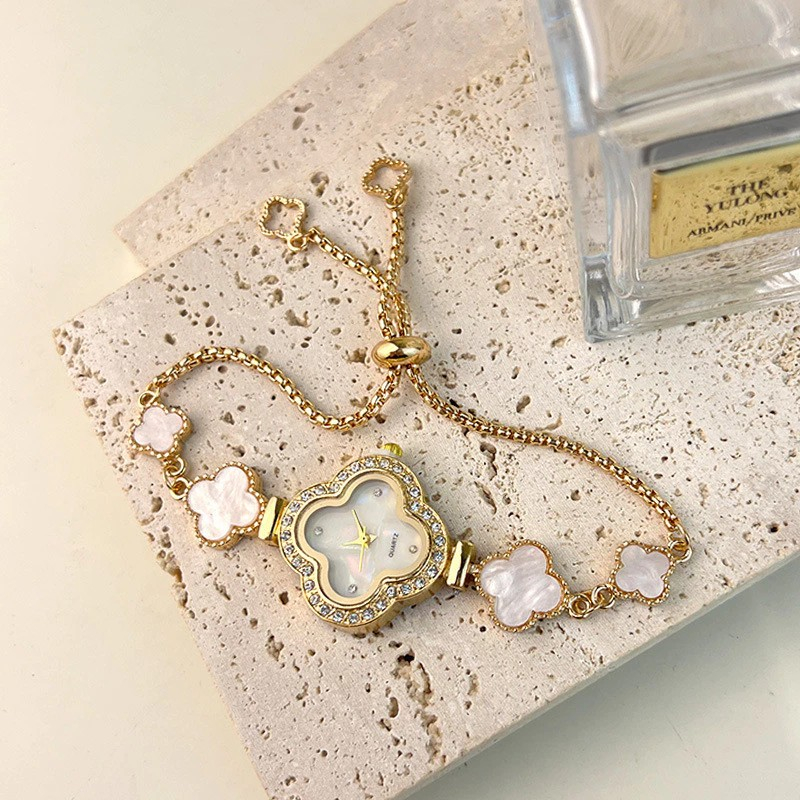 Relógio Feminino Trevo Quartz Luxo Strass Pulseira Ajustável Fundo Branco Perola Ouro e Prata
