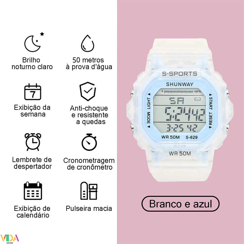 | Relógio Femininoa Prova Dágua Digital Esportivo Modo Leve Resistent... este produto | R$ 24,99 | 92% | 4.8/5 | 6 |