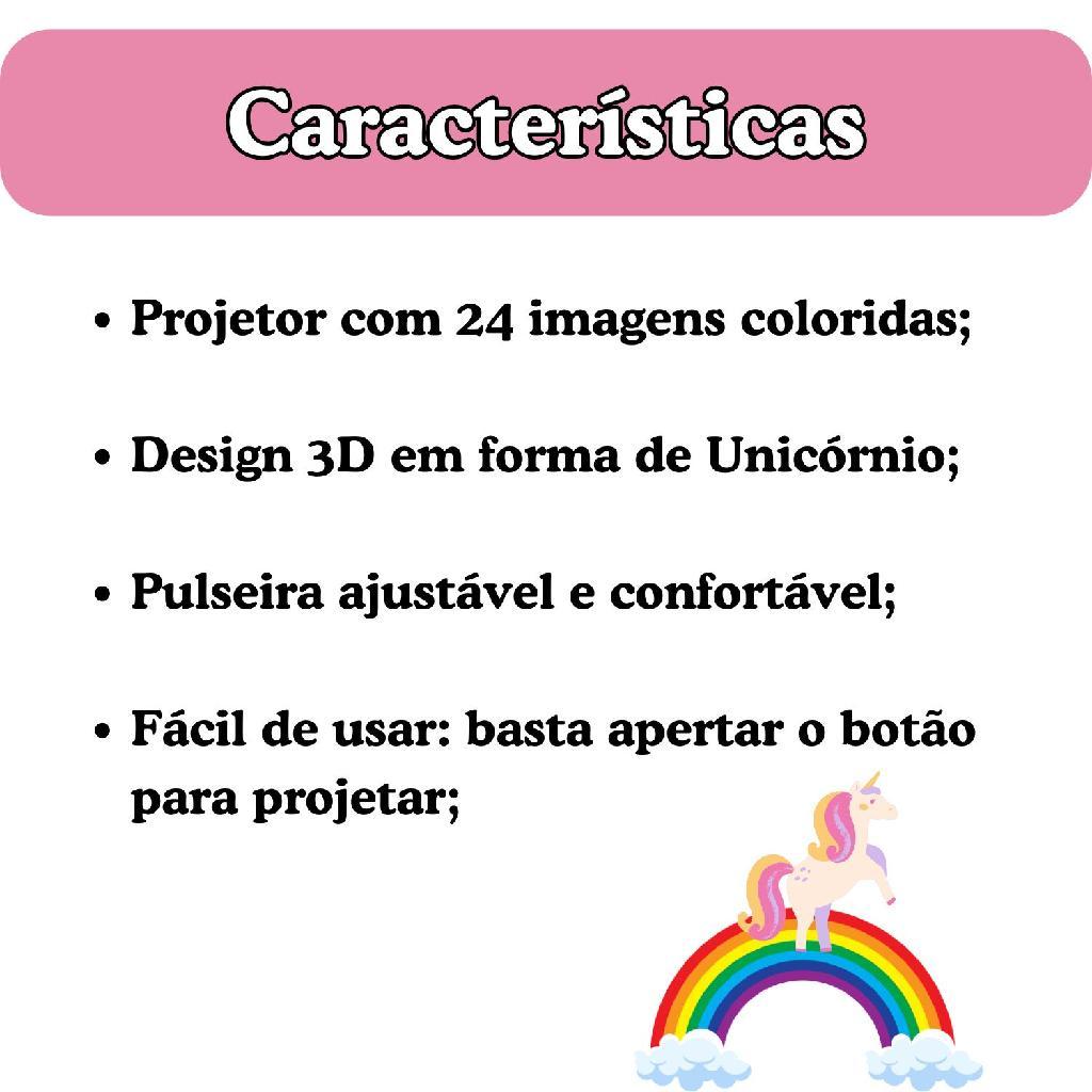 Transforme o tempo em diversão com o Relógio Projetor Unicórnio Infantil! Além de estiloso, ele projeta imagens incríveis de unicórnios, tornando a brincadeira muito mais divertida. Ideal para crianças apaixonadas pelo mundo da fantasia, estimula a imaginação e garante momentos de entretenimento educativo. --------------------------------------------------------------------------------------------- PERGUNTAS FREQUENTES 1 – O relógio projeta quantas imagens? O relógio possui projeção de aproximadamente 24 imagens diferentes. 2 – O produto é original? Sim, produto original de fábrica, enviado lacrado. ------------------------------------------------------------------------------------------------------ FICHA TÉCNICA Marca: For Kids Modelo: Relógio Projetor Infantil Referência: 154 Dimensões (C x A x L): 23 x 8 cm (aproximado) Recomendação: Para crianças a partir de 3 anos de idade Peso da embalagem: 0,130 kg (aproximado) Material / Composição: Plástico resistente e seguro para crianças Benefícios: Estimula criatividade, imaginação e interesse pelo mundo dos dinossauros Funcionalidade: Projeta imagens de unicórnios ao pressionar o botão lateral Número de Registro: 006567/2019 O QUE ACOMPANHA: 01 Relógio Projetor Infantil com projeção de 24 imagens Garantia do fabricante: 3 meses ----------------------------------------------------------------------------------- Obrigado pela preferência!