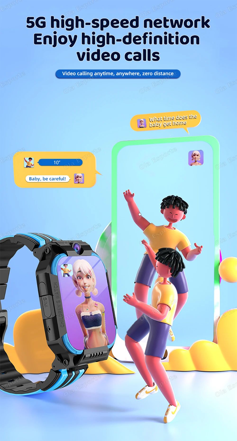 Relógio Inteligente para Crianças Relógio de Vídeo Gravação de Som Android Relógio Infantil G Original 5G Crianças Relógio Inteligente Vídeo Chamada de Telefone Gravação de Som Android Relógio Infantil GPS Smartwatch Cha Características: 1. suporte para baixar o Whatsapp,Line,2012,Tiktalk no relógio. 2. Capacidade da bateria: 680mah. 3. Versão da rede 5G:GPS+WIFI+LBS posicionamento, Localize mais preciso; 4. A versão de rede 5G: Rede 5G, chamada VOLET Video, chamada de voz, monitor remoto, acesso à internet por WI-FI, LTE GPRS Data.conecte mais rápido e estável; 5. Chamada de vídeo WeChat suporta chamada de vídeo WeChat,Pixel:30W Design impermeável (por favor, não use em água quente/sal, chuveiro quente, natação ou mergulho!) 7. Tela de toque colorida HD de 1,83 polegadas, exibição IPS de ajuste total, rachadura à prova de explosão, resistente a arranhões resistentes a quedas, à prova d'água, à prova de poeira, resolução 240*284; 8. O monitor de saúde do suporte do relógio como pedômetro. Deixe as crianças terem uma infância de segurança e engraçada. 9. Alça de silicone de qualidade alimentar, anti-estática, à prova de poeira, à prova de suor. 10. Relógio de versão de rede 5G Suporte WI-FI Access, conexão Bluetooth. 11. Idioma do relógio:Inglês, árabe, russo, turco, indonésio Suporte de Software APP de construção Relógio, interface principal, Quadros, SMS, telefone, livro de vestido de anúncio, configurações, micro chat, amigos de toque, chamada de vídeo, contagem de passos, agenda de classe, calculadora, cronômetro, galeria, despertador, câmera, atualização online OTA O cabo de dados entregue é aleatório Lista de embalagem de embalagem: Relógio inteligente não inlcudo sim card) Cabo de Carga Instrução Caixa Original de 1 * 1 * caixa Original OBSERVAÇÃO: 1. Por favor, compre o cartão sim da sua empresa GSM principal local e abra a internet 5G com dinheiro e dados válidos. 2. Por favor, desligue o relógio durante o cartão sim de inserção, também remova o ode do pino c se o cartão sim tiver. 3. A versão estrangeira não tem função climática, observe-o, obrigado! 4. Por favor, use o adaptador 5V 2A para conectar o carregador usb para carregar, obrigado! 5. À prova d'água de lavagem: É apenas à prova d'água de vida: É à prova d'água permitir que o relógio seja usado normalmente ao lavar as mãos e em dias chuvosos, mas não permite nadar e tomar banho. Não é permitido mergulhar o relógio em água! Tenha cuidado para evitar líquidos corrosivos como higienizador de mão, sabão entrar no relógio e causar danos ao componente.