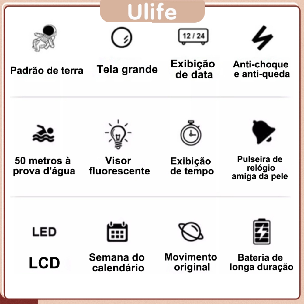 🎉🎉Bem-vindo à loja oficial da Ulife!🎉🎉 ✨️Todos os nossos produtos sǎo enviados de sǎo Paulo ✨️Produto original,Garantia de Qualidade. ✨️Processaremos seu pedido o mais rápido possivel. ✨️Se vocé estiver satisfeito com nossos produtos e servicos,porfavor,dè-nos umd avaliacdo de cinco estrelas. ✨️Se vocé tiver alguma dúvida, nǎo hesite em nos contatar, fcareifeliz em resolver seu problema! 🎈🎈Instruções DE USO:🎈🎈 1️⃣Pressione o botão imediatamente, uma vez, a luz acenderá e o tempo será exibido. Pressione mais uma vez, e a data será exibida. Pressione novamente, e a data será exibida. 2️⃣Quando a luz estiver ligada, pressione o botão com o dedo por cerca de 3 segundos, e a hora piscará. Neste momento, pressione o botão para ajustar a hora. Neste momento, pressione o botão para ajustar a hora. Pressione uma vez para aumentar a hora. 3️⃣Depois de ajustar o tempo, pressione o botão por 3 segundos e os minutos piscarão. Neste momento, pressione o botão para ajustar os minutos. Pressione uma vez para adicionar um minuto. 4️⃣Após carregar o número minuto, pressione o botão por cerca de 3 segundos, o mês piscará, e o botão será ajustado neste momento. 5️⃣Após ajustar o botão por cerca de 3 segundos e a data será ajustada no mês, pressione o botão por cerca de 3 segundos e a data piscará. Neste momento, pressione o botão para ajustar a data. Pressione o botão uma vez para adicionar um dia. 6️⃣Após ajustar, pressione o botão por alguns segundos ou aguarde alguns segundos para retornar à interface de exibição de tempo. Não haverá operação por 3 segundos. Entrar no modo de economia de energia. 🎈🎈Especificações:🎈🎈 ⏩️Tipo de exibição: número ⏩️Desempenho À prova d'água: 50m ⏩️Diâmetro do mostrador: 40,5 mm ⏩️Espessura: 10mm ⏩️Função:Data e hora ⏩️material Do espelho: espelho de plástico ⏩️Estilo da fivela: fivela escondida do cinto ⏩️Material da fivela: aço inoxidável ⏩️material Da cinta: TPU ⏩️material Da caixa: ABS ⏩️Conteúdo do pacote:1 * relógio⌚