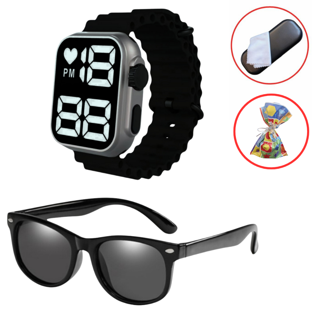 1X RELÓGIO DIGITAL INFANTIL À PROVA D'ÁGUA 1X OCULOS DE SOL INFANTIL 1X CASE OCULOS + PANO LIMPEZA (ESCOLHER OPÇÃO "COM CASE") 1X CASE OCULOS + PANO LIMPEZA + EMBRULHO PRESENTE ( ESCOLHER OPÇÃO "COM CASE + EMBRULHO) Óculos Proteja os olhos do seu filho enquanto adiciona um toque de estilo com nossos óculos de sol infantis. Com lentes polarizadas que bloqueiam 100% dos raios UV prejudiciais do sol, esses óculos são ideais para um dia ensolarado na praia ou em um passeio de bicicleta ao ar livre. Com materiais duráveis e resistentes, eles são perfeitos para suportar as brincadeiras e atividades do dia a dia. Não deixe que o sol prejudique a diversão do seu filho. Invista em nossos óculos de sol infantis de alta qualidade e proteja os olhos do seu filho enquanto eles brincam e exploram o mundo ao seu redor. Nome: Óculos de Sol Infantil Estilo do estilo: Forma quadrada Adequado: Proteção Solar, Passeio Grau de resistência UV de resistência UV: UV380 Relógio Infantil Mantenha seu filho sempre na hora certa e com estilo com o nosso relógio infantil de LED. Com um mostrador digital de fácil leitura, o relógio é perfeito para ensinar às crianças a importância da pontualidade enquanto acrescenta um toque de diversão ao seu dia a dia. Com seu design durável e resistente à água, nosso relógio infantil é adequado para todas as atividades do dia a dia, desde a escola até as brincadeiras no parque. Com sua pulseira ajustável, ele se adapta a pulsos de todos os tamanhos, garantindo um ajuste confortável para todas as crianças. - Estilo: Esporte e Casual - Material da Caixa: PC Plásticos - Material da Pulseira: Silicone - Movimento: Digital - Funções: Apenas Hora e Data