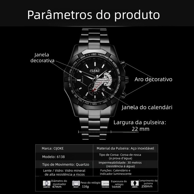 √ Produto Importado 100% Original! √ Pronto para enviar dentro de 24 horas! √ Siga minha loja para obter Voucher! Siga-me para novos itens! Características especiais: Luminoso, Data, Resistência ao Impacto Tipo de movimento: Quartzo Estilo: Moda/Business Modo de exibição do mostrador: Ponteiro Pessoas aplicáveis: Masculino Material da cinta: Aço inoxidável Material da Fechadura: Aço Inoxidável Material do espelho: Vidro temperado Mineral Material do escudo: Liga Tipo de coroa: Coroa espiral Tipo de Fechadura: Fivela Dobrável Forma do Mostrador: Redondo Material da correia 6140- correia Espessura: 12mm Comprimento da alça de alça: 240mm Largura da alça da alça: 20mm Nível Impermeável: 3ATM (30m) Nota: Não Pressione nenhum botão na água. Ideia de Presente: O Relógio É Um Grande Presente Para Aniversário, Amigo Aniversário, Aniversário Relativo, Dia da Mãe, Presente de Formatura, Presente Dia dos Namorados Ou Presente de Trabalho E Festa. (Adequado para crianças e adultos) O que há de dentro? Relógio * 1 Caixa * 1 Ferramenta de ajuste de alça * 1 Manual * 1 Característica] O relógio é à prova d'água para uso diário e pode ser lavado à mão e exposto à chuva, mas não pode ser usado no chuveiro ou na natação, muito menos em água quente ou sauna a vapor, pois o vapor d'água destruirá o anel à prova d'água do relógio e causar grandes danos ao relógio. Função de calendário: Puxe o botão uma vez para ajustar o calendário/puxe o botão duas vezes para ajustar o tempo. Resistência ao impacto: Após o teste de arranhões, o mostrador ainda está intacto. Função luminosa do tempo, mesmo em um ambiente escuro: Veja o tempo claro, mesmo em um ambiente escuro. Movimento Importado: Movimento Importado Original, Tempo Mais preciso. Vidro Temperado Mineral: Alta Dureza, Resistência ao Impacto, Resistência a Arranhões, Alta Resistência à Temperatura Alça de aço inoxidável de alta qualidade: Não alérgica, não desbota, confortável de usar, não é fácil de apodrar. Notas de notas de notas ◆Por favor, insira o número de telefone e o endereço precisos. ◆Verifique antes Do pedido. Após o pedido, não aceitamos troca de nome, número, endereço ou Item. ◆Elogios de cinco estrelas (Enviar cupom) ◆Se O Produto estiver Danificado Ou Não Atende aos Requisitos, Não se Apresse Para Dar Uma Avaliação Negativa, Dê-nos uma Chance Para Resolver O Problema Para Você. ◆Obrigado por suas compras!