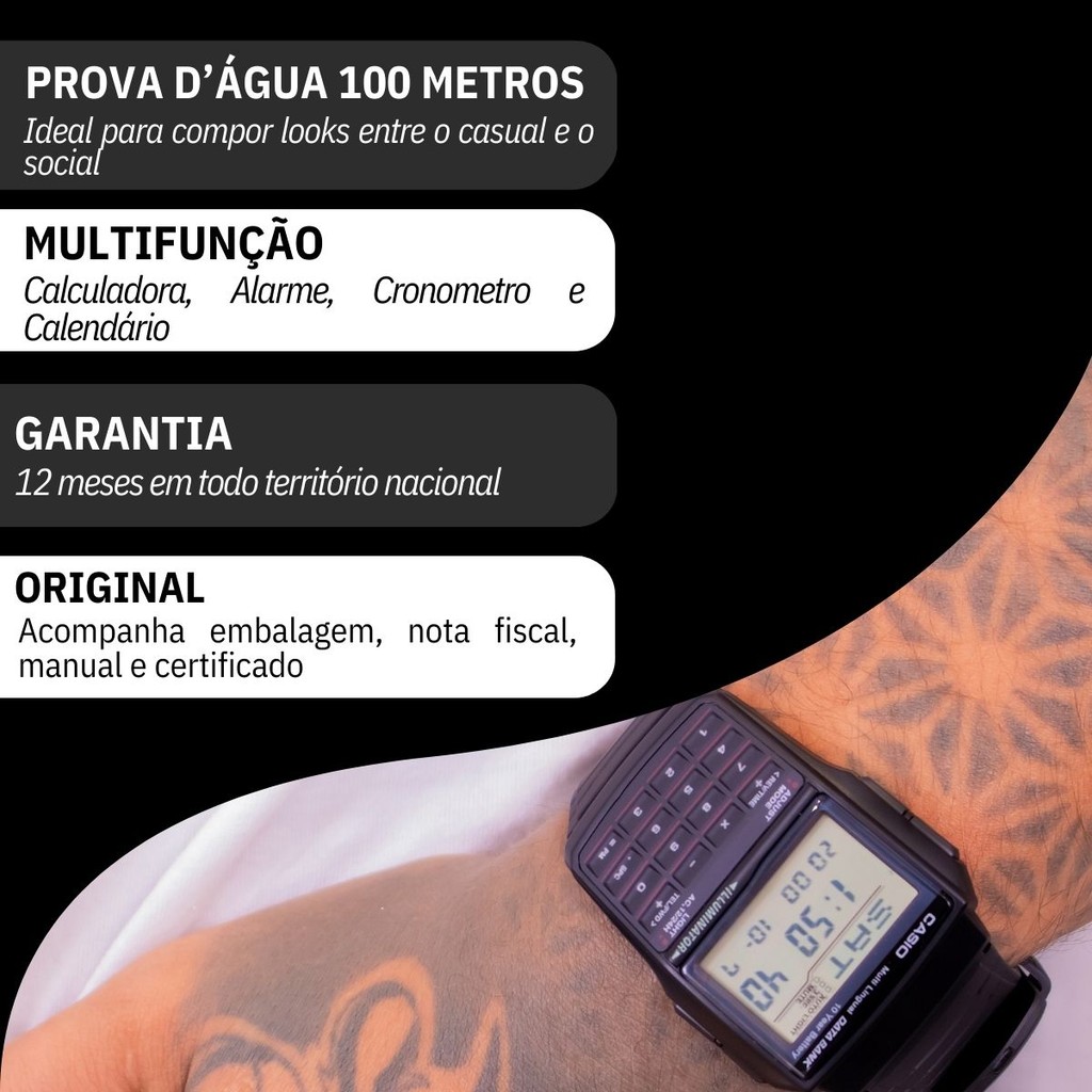 Você está procurando um relógio casio vintage para acompanhar o seu dia a dia? Seja bem vindo à RBM WEBSHOP - todos os nossos relógios são originais e a pronta entrega para envio imediato. Veja as PRINCIPAIS CARACTERÍSTICAS do Relógio Casio Vintage Calculadora: Informações Básicas Marca: Casio Modelo: DBC-32-1ADF Gênero: Masculino Resistência à Água: 3atm – 30mts: Pode tomar uma chuva e lavar as mãos Medidas do Relógio Tamanho (Diâmetro): 50.4 × 37.4 × 12 mm (MÉDIO) Circunferência da pulseira e tamanho máximo de ajuste de punho: 20 cm Espessura: 1,2 cm Peso: 34 gramas Materiais do Relógio Composição do Vidro: Vidro de Resina Material da Caixa: Resina Material da Pulseira: Resina Material da Tampa: Aço Inoxidável Características do Relógio Mecanismo: Digital Alimentação: Bateria Duração aproximada da bateria: 10 anos Fecho: Fivela Tampa Posterior: Parafusado Funções Especiais Hora mundial Hora dual Outro: Horário de verão Cronômetro Cronômetro de 1/100 de segundo Capacidade de medição: 23:59'59,99" Modos de medição: Tempo decorrido, tempo parcial, tempos do 1º e 2º lugares Alarme / Sinalização Sinalização a cada hora Alarmes multifuncionais 5 alarmes multifuncionais independentes (4 alarmes com um toque e 1 alarme de um toque/com soneca) Tipo de alarme: Alarme diário, alarme de data, alarme de 1 mês, alarme mensal Luz Luz de fundo LED Circuito automático de luz, fosforescência Cor da luz LED: laranja Calendário Calendário automático (até o ano 2099) Precisão Precisão: ±30 segundos por mês Outros recursos Calculadora de 8 dígitos Modos de cálculo: Operações aritméticas e conversão de moeda Formatos de 12/24 horas Telememo Capacidade da memória: Até 25 grupos de dados, com nome de 8 caracteres e telefone de 15 dígitos Outros: Tela de memória restante, classificação automática, aceita caracteres de 13 idiomas (inglês, português, espanhol, francês, holandês, dinamarquês, alemão, italiano, sueco, polonês, romeno, turco, russo) Modo de indicação das horas regular: Hora, minuto, segundo, am/pm, ano, mês, data, dia Cores Mostrador: Digital Caixa: Preto Pulseira: Preto Garantia 1 ano de garantia em todo território nacional com a rede autorizada Conteúdo da Embalagem Este produto acompanha Manual em Português e Nota Fiscal, Embalagem de Fabrica Original e Garantia Nacional do Fabricante. VAMOS CONHECER MELHOR SOBRE A LOJA RBM WEBSHOP RELOGIOS? Somos uma das melhores e maiores lojas de relogios no Brasil. Todos os relógios vendidos pela nossa loja são 100% originais, contém nota fiscal, certificado, manual de instruções e garantia de 12 meses com a rede de assistência em todo o Brasil.