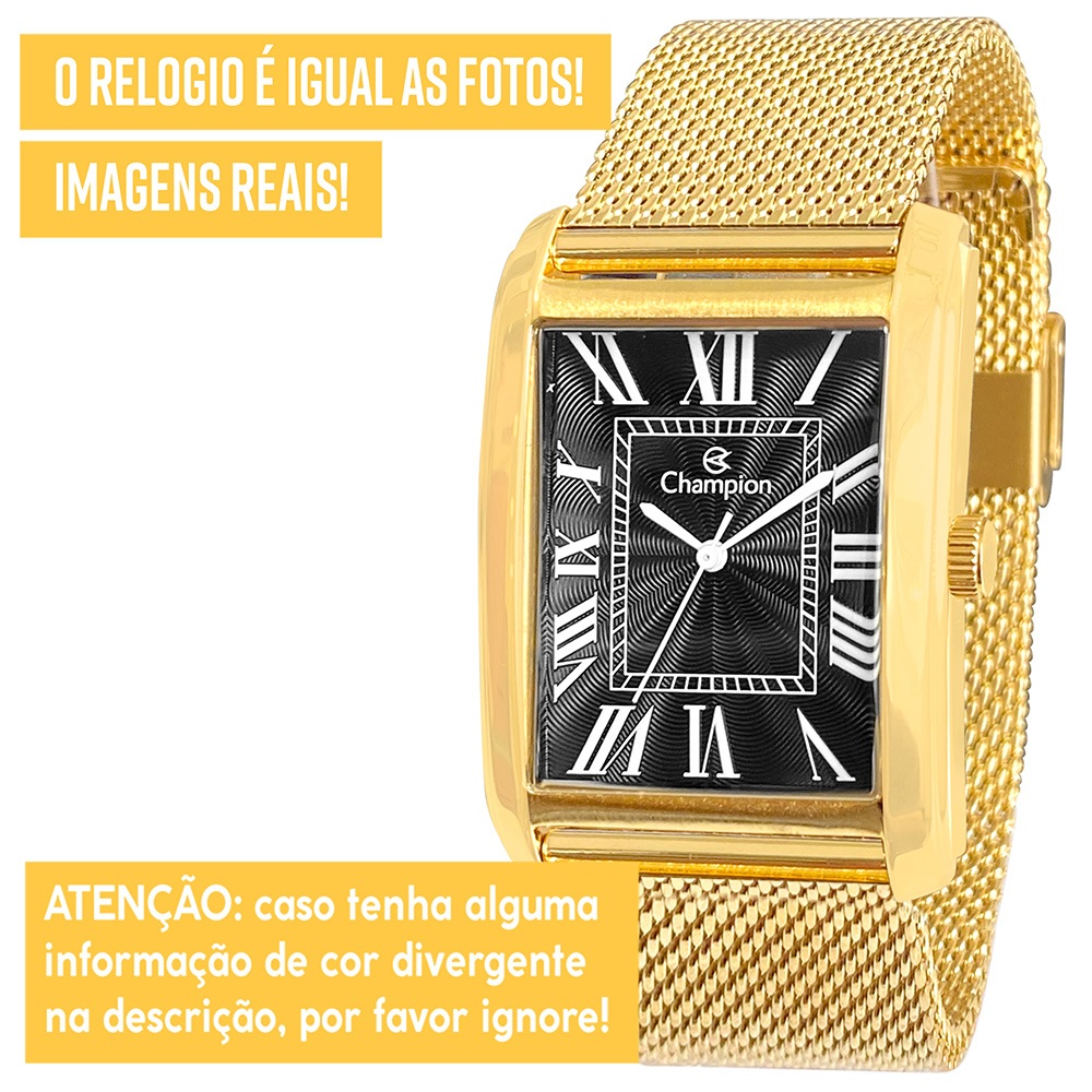 Bem vindo! Procurando um presente perfeito? Encontrou! Dê o lindo kit Champion de presente para você mesmo, ou para alguém querido! *1 ANO DE GARANTIA CHAMPION - Produto com NOTA FISCAL* *ACOMPANHA CARTEIRA* Atuamos somente com produtos 100% ORIGINAIS! Leve em um especialista de sua região para comprovar. Ficha Técnica PROVA D'ÁGUA: Sim – selo de resistência 3 ATM (resistência até 30 metros de profundidade) MATERIAL DO VIDRO: Cristal mineral resistente a riscos MAQUINÁRIO: Analógico – quartzo - bateria MATERIAL DO RELÓGIO: Liga de aço COR DO FUNDO: Preto Medidas TAMANHO DA CAIXA (mostrador): 3,5 cm (35 mm) ESPESSURA DA CAIXA (mostrador): 0,9 cm (9 mm) LARGURA DA PULSEIRA: 2,4 cm (24 mm) CIRCUNFERÊNCIA DA PULSEIRA: 26 cm Acompanha Relógio Champion, caixa original Champion, carteira, manual de instruções em português, certificado de garantia e nota fiscal. Nossos produtos são todos tratados com máximo cuidado, profissionalismo e atenção. Enviamos o seu relógio em uma embalagem reforçada, protegida por dentro e por fora. Caso não tenha gostado ou simplesmente se arrependeu, devolva o produto sem preocupações. Você tem 30 dias a partir do recebimento para devolvê-lo. COMPRE COM SEGURANÇA Revendedor autorizado Champion