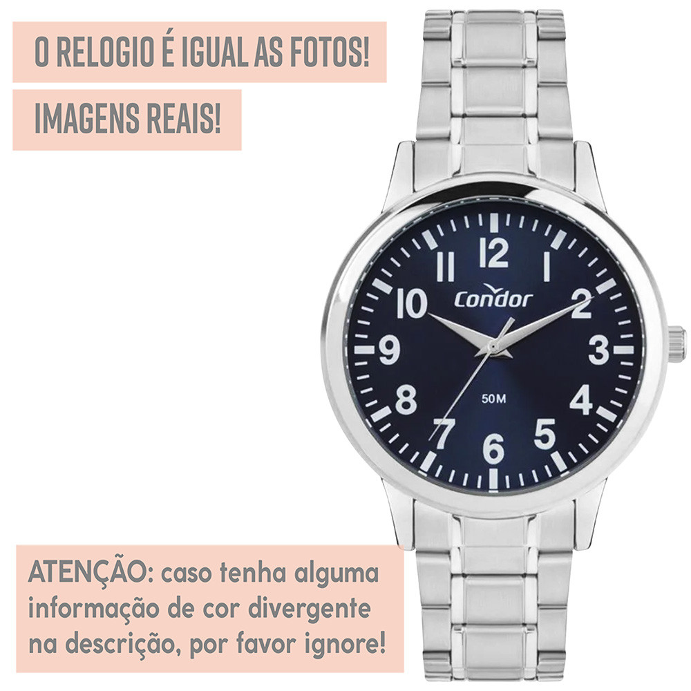 Procurando por uma joia cheia de estilo, tecnologia e que dure a vida inteira? Encontrou! Dê o incrível relógio Condor de presente para você mesmo ou para alguém querido. *1 ANO DE GARANTIA CONDOR - Produto original com NOTA FISCAL* Atuamos somente com produtos 100% ORIGINAIS! Leve em um especialista de sua região para comprovar. Ficha Técnica RESISTENTE A ÁGUA: Sim - selo de resistência 5 ATM (resistência até 50 metros de pressão atmosférica) MATERIAL DO VIDRO: Cristal mineral resistente a riscos MAQUINÁRIO: Analógico - Quartzo - bateria MATERIAL DO RELÓGIO: Aço inoxidável COR DO FUNDO: Azul Medidas TAMANHO DA CAIXA (mostrador): 4,3 cm (43 mm) ESPESSURA DA CAIXA (mostrador): 1,0 cm (10 mm) LARGURA DA PULSEIRA: 1,6 cm (16 mm) CIRCUNFERÊNCIA DA PULSEIRA: 27 cm (pode ser diminuída para servir em todo tipo de pulso) Acompanha Relógio Condor, caixa original Condor, manual de instruções em português, certificado de garantia e nota fiscal. Nossos produtos são todos tratados com máximo cuidado, profissionalismo e atenção. Enviamos o seu relógio em uma embalagem reforçada, protegida por dentro e por fora. Caso não tenha gostado ou simplesmente se arrependeu, devolva o produto sem preocupações. Você tem 30 dias a partir do recebimento para devolvê-lo. COMPRE COM SEGURANÇA Revendedor autorizado Condor