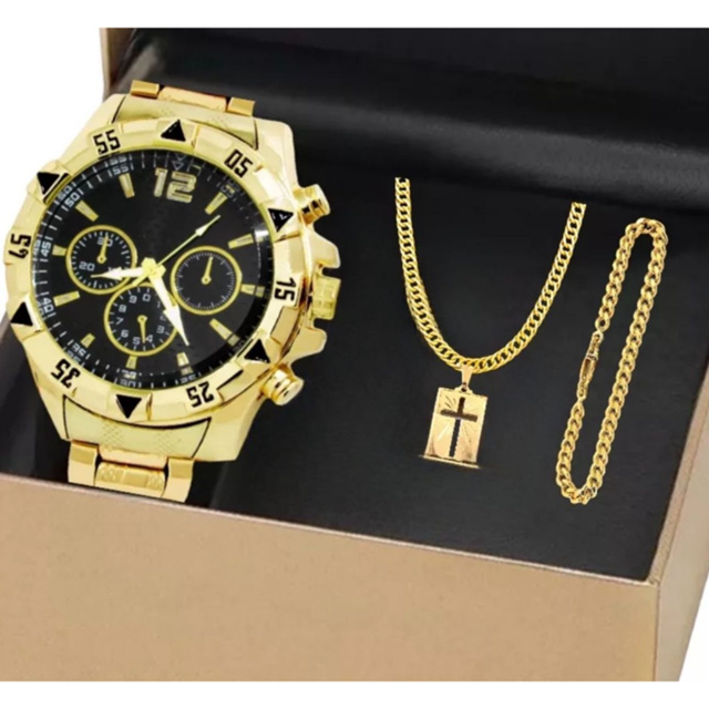 Relógio masculino + Conjunto AÇO corrente e pulseira pingente cruz Presente Masculino