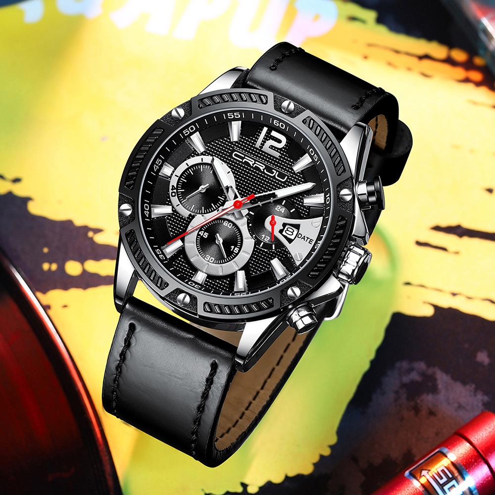 Relógio Masculino CRRJU Marca Original Cronógrafo Luminoso Couro Casual Empresarial Esportivo Quartzo À Prova D'água 2283 XL