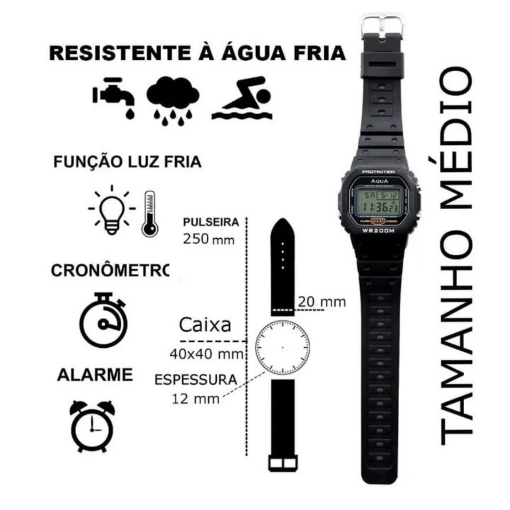 𝗘𝗡𝗩𝗜𝗢 𝗜𝗠𝗘𝗗𝗜𝗔𝗧𝗢 O AQUA GP-519 WR200M possui design moderno e esportivo, este relógio é perfeito para homens que buscam estilo e funcionalidade. Sua caixa hexagonal e com fecho em pulseira proporciona conforto ao usar. Mostrador digital preto, este relógio possui diversas funções. Características: ✔ Estrutura e pulseira confortável e resistente ✔ Vidro mostrador em resina ✔ Pulseira Borracha ✔ Tampa traseira parafusada e assinada ✔ Movimento A quartzo Digital Formato Hora 12/24 Horas ✔ Resistente à água e a prova d ́agua 3 ATM Funções: ✔ Alarme diário, BIP de hora em hora só programar verá a setinha quando ativado >>> ✔ Datador Sim ✔ Cronometro Progressivo Sim ✔ Luz noturna SIM Dimensões: ✔ Dimensões na segunda foto tem todas as medidas ✔ Comprimento total da Pulseira 25,0 cm, Largura 1.5cm ✔ Caixa do Relógio 40mm por 40mm TAMANHO MÉDIO OBSERVAÇÃO: Não tomar banho com agua quente por causa do vapor Não apertar os botões debaixo d'água Qualquer dúvida estamos a disposição no chat.
