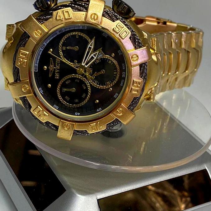 ACOMPANHA: Relógio Dourado Grande Caixa Especificações: Caixa e discar Tamanho da caixa: 55 mm Tipo de coroa: Empurre Material do mostrador: Metal Material: aço inoxidável Material da Pulseira: Aço Inoxidável Tom: Ouro Comprimento: 225 mm Tamanho: 44 mm