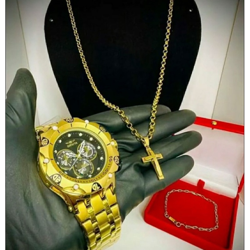 Relógio masculino invicta+conjunto de corrente e puseira o kit completo