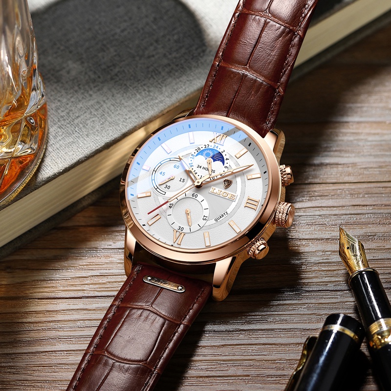 Relogio Masculino LIGE de Quartzo Estilo Militar Esportivo com Pulseira de Couro À Prova D’Água + Caixa
