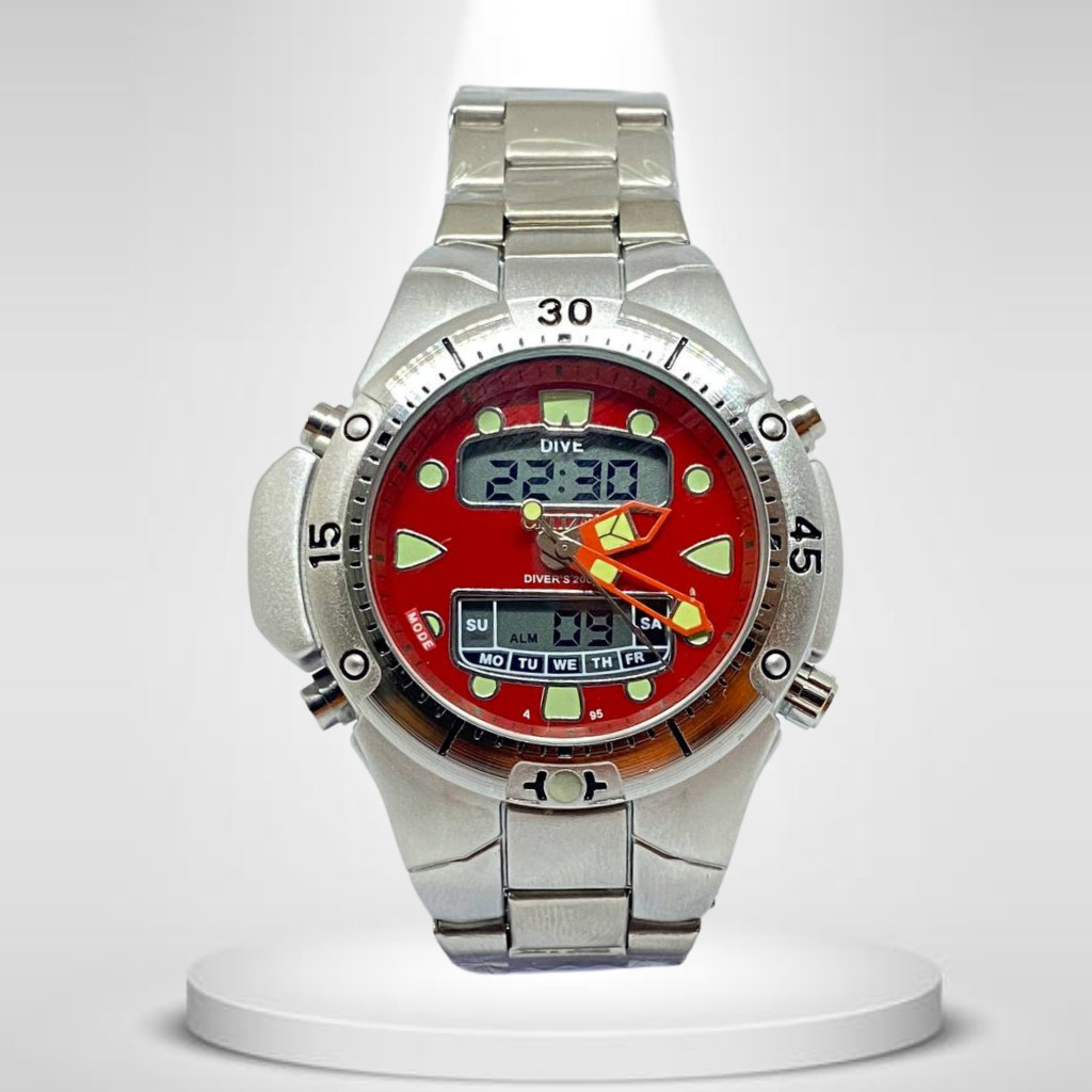Nunca perca o tempo e esteja pronto para suas aventuras aquáticas com o Relógio Aqualand. Este relógio de mergulho é a escolha perfeita para entusiastas do mar que desejam estar sempre em sintonia com os números e ter um parceiro confiável durante suas explorações subaquáticas. Com uma resistência à água de até 20 metros, este modelo analógico-digital oferece diversas funções essenciais para mergulhadores, incluindo medição de profundidade e controle de oxigênio. Além disso, ele adiciona um toque de modernidade ao seu visual e pode ser usado em diversas ocasiões. FUNÇÕES - Exibição analógica e digital - Cronógrafo progressivo - Calendário digital completo - Opção de horário 12/24 horas - Alarme diário - Alarme de profundidade de mergulho - Alarme de tempo de mergulho (controle de oxigênio) - Profundômetro CARACTERÍSTICAS - Sistema de energia: Bateria - Ponteiros e índices luminosos - Coroa rosqueada - Tampa posterior rosqueada - Resistência à água: 20 metros - Vidro resistente a arranhões - Pulseira de aço inoxidável com escala de profundidade e descompressão - Indicado para: Atividades diárias, mergulho, esportes aquáticos e estilo casual. Tipo de Relógio: Analógico e Digital Como é feito o envio do produto? Para garantir que seu relógio Aqualand chegue em perfeitas condições, ele será enviado em uma embalagem de proteção adequada. Prazo de envio: Comprometemo-nos a enviar seu pedido em até 1 dia útil após a confirmação do pagamento. É possível retirada na loja? Somos uma loja exclusivamente online e atendemos clientes em todo o Brasil. ATENÇÃO: Todas as imagens e informações deste produto são autênticas e de nossa própria autoria. Não utilizamos imagens genéricas ou de terceiros. Convidamos você a conhecer a qualidade do Relógio Aqualand e fazer sua compra com total segurança. Nossa marca e equipe estão empenhadas em proporcionar a melhor experiência na pré-venda e pós-venda, garantindo uma compra segura.