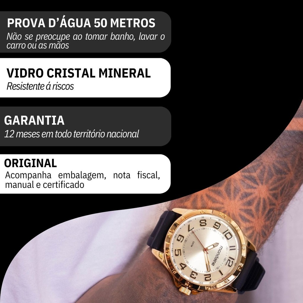 Você está procurando um relógio analógico masculino para acompanhar o seu dia a dia? Seja bem vindo à RBM WEBSHOP - todos os nossos relogios são originais e a pronta entrega para envio imediato. Veja as PRINCIPAIS CARACTERÍSTICAS do Relógio Mondaine Masculino Analógico Informações Básicas Marca: Mondaine Modelo: 53829GPMVDI4 Gênero: Masculino Resistência à Água: 5atm – 50mts: Pode lavar as mãos e tomar banho Medidas do Relógio Tamanho: 4,8cm (GRANDE) Espessura: 1,3 cm Circunferência da Pulseira: 25 cm Peso: 80 gramas Materiais do Relógio Composição do Vidro: Cristal Mineral (RESISTENTE A RISCOS) Material da Caixa: Metal Material da Pulseira: Silicone Material da Tampa: Aço Inox Características do Relógio Mecanismo: Quartz Alimentação: Bateria Fecho: Fivela Tampa Posterior: Rosca Cores Mostrador: Dourado Caixa: Dourado Pulseira: Preto Garantia 1 ano de garantia em todo território nacional com a rede autorizada Conteúdo da Embalagem O relógio vai na caixa original, com a nota fiscal, certificado de garantia e manual de instrução. VAMOS CONHECER MELHOR SOBRE A LOJA RBM WEBSHOP RELOGIOS? Somos uma das melhores e maiores lojas de relogios no Brasil. Todos os relógios vendidos pela nossa loja são 100% originais, contém nota fiscal, certificado, manual de instruções e garantia de 12 meses com a rede de assistência em todo o Brasil. Dúvidas? Pergunte, e será um enorme prazer lhe atender!