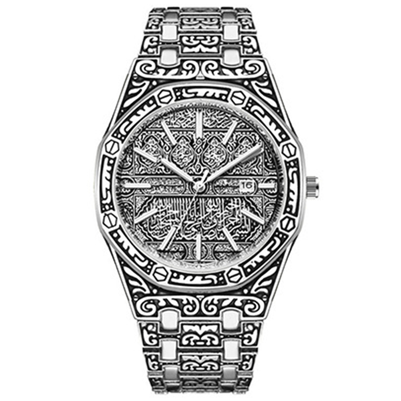 Relógio Masculino Octogonal Gravado Elegante : Design Clássico Dourado Com Calendário Prático