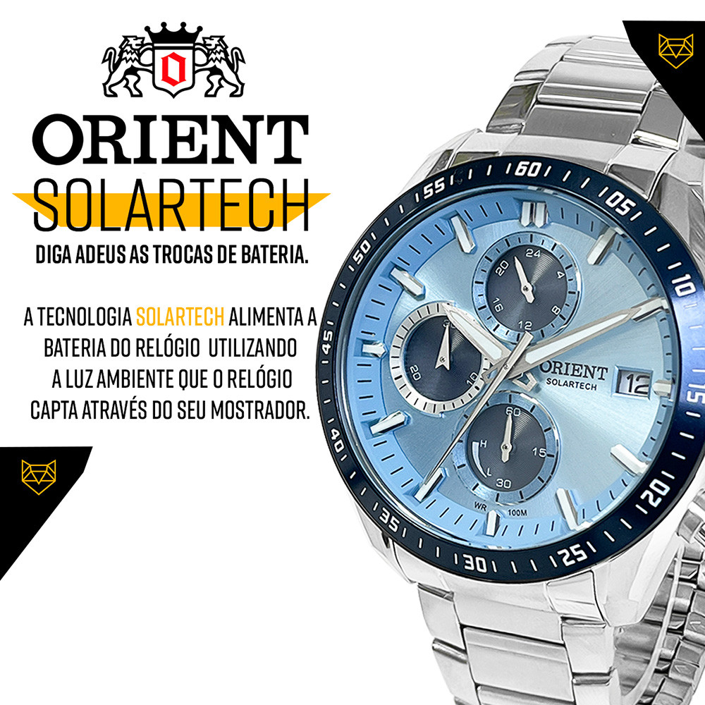 Bem vindo! Procurando por uma joia cheia de estilo, tecnologia e que dure a vida inteira? Encontrou! Dê o incrível relógio Orient de presente para você mesmo ou para alguém querido. *1 ANO DE GARANTIA ORIENT - Produto com NOTA FISCAL* Atuamos somente com produtos 100% ORIGINAIS! Leve em um especialista de sua região para comprovar. Você sabe o que é um ORIENT SOLARTECH? O sistema SOLARTECH, é uma tecnologia Orient na qual o relógio é alimentado por luz solar ou artificial. O relógio dispensa trocas de bateria, pois a tecnologia SOLARTECH carrega o relógio automaticamente. Os modelos SOLARTECH possuem um mecanismo interno que captura a luz natural ou artificial e transforma em energia. Ficha Técnica PROVA D'ÁGUA: Sim - selo de resistência 10 ATM (resistência até 100 metros de profundidade) MATERIAL DO VIDRO: Cristal mineral resistente a riscos MAQUINÁRIO: Tecnologia SOLARTECH - O relógio Orient Solartech funciona sem bateria pois seu mecanismo transforma luz natural e artificial em energia. MATERIAL DO RELÓGIO: Aço inoxidável. Medidas TAMANHO DA CAIXA (mostrador): 4,8 cm (48 mm) - tamanho médio ESPESSURA DA CAIXA (mostrador): 1,5 cm (15 mm) LARGURA DA PULSEIRA: 2,0 cm (20 mm) CIRCUNFERÊNCIA DA PULSEIRA: 26 cm (pode ser diminuída para servir em todo tipo de pulso) Funções Solartech Cronógrafo funcional Ponteiros Fosforescentes Calendário Acompanha Relógio Orient, caixa original Orient, manual de instruções em português, certificado de garantia e nota fiscal. Nossos produtos são todos tratados com máximo cuidado, profissionalismo e atenção. Enviamos o seu relógio em uma embalagem reforçada, protegida por dentro e por fora. Caso não tenha gostado ou simplesmente se arrependeu, devolva o produto sem preocupações. Você tem 30 dias a partir do recebimento para devolvê-lo. COMPRE COM SEGURANÇA Revendedor autorizado Orient