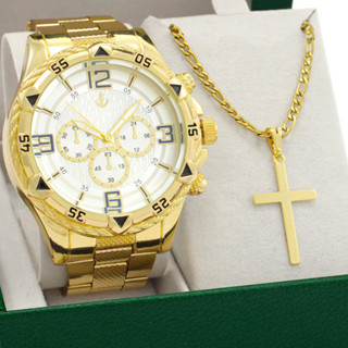 Relógio Masculino Original Aço Inox a Prova D'água Dourado + Corrente Cruz + Pulseira OuroNEWBASICSBRc