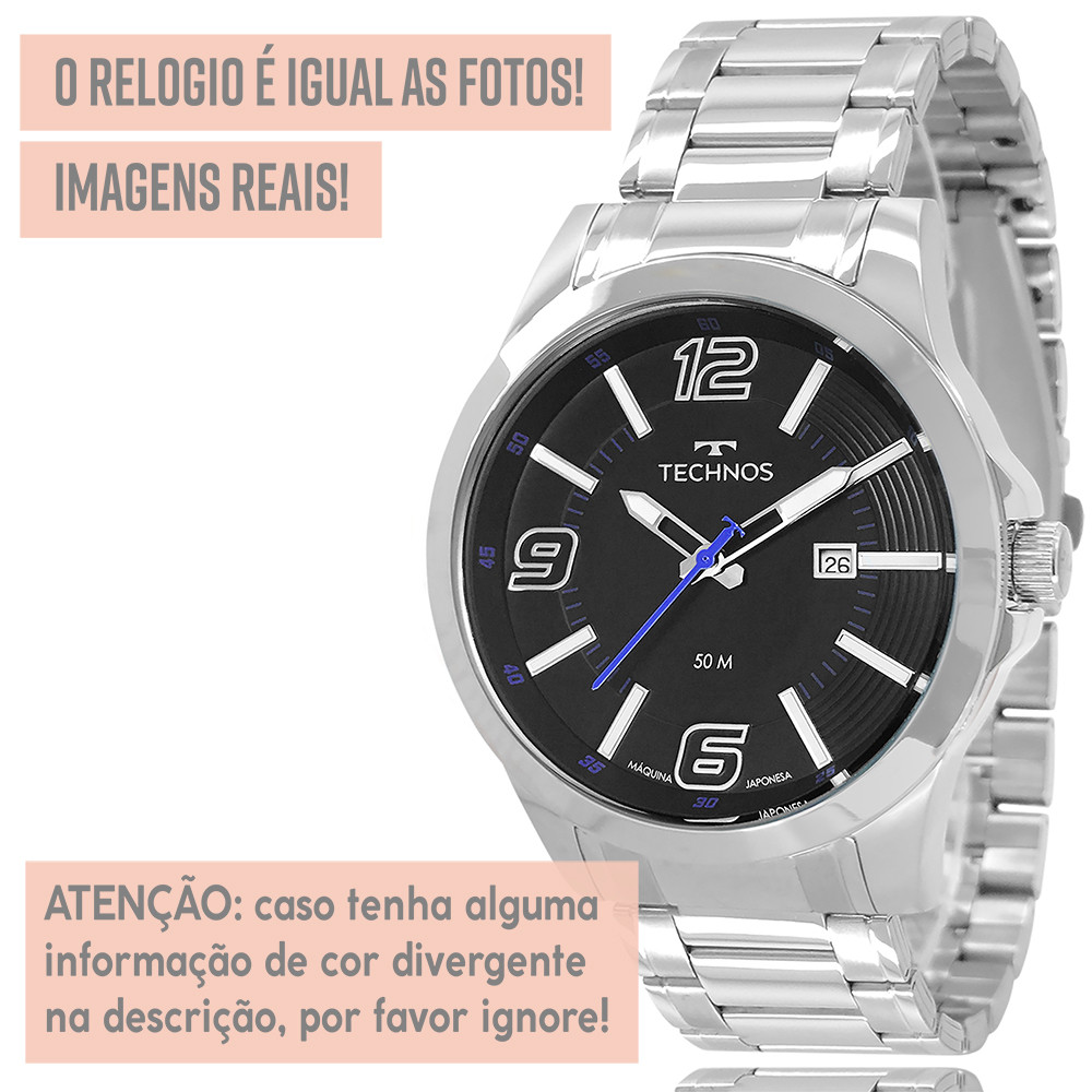 Bem vindo a nossa loja! Procurando um presente perfeito? Encontrou! Dê o lindo Technos de presente para você mesmo, ou para alguém querido! *1 ANO DE GARANTIA TECHNOS - Produto com NOTA FISCAL* Atuamos somente com produtos 100% ORIGINAIS! Leve em um especialista de sua região para comprovar. Ficha Técnica PROVA D'ÁGUA: Sim - selo de resistência 5 ATM (resistência até 50 metros de profundidade) MATERIAL DO VIDRO: Cristal mineral resistente a riscos MAQUINÁRIO: Analógico - quartzo - bateria MATERIAL DO RELÓGIO: Aço inoxidável COR DO FUNDO: Preto Medidas TAMANHO DA CAIXA (mostrador): 4,7 cm (47 mm) – tamanho médio ESPESSURA DA CAIXA (mostrador): 1,0 cm (10 mm) LARGURA DA PULSEIRA: 2,0 cm (20 mm) CIRCUNFERÊNCIA DA PULSEIRA: 26 cm Funções Calendário Acompanha Relógio Technos, caixa original Technos, carteira Lebrave, manual de instruções em português, certificado de garantia e nota fiscal. Nossos produtos são todos tratados com máximo cuidado, profissionalismo e atenção. Enviamos o seu relógio em uma embalagem reforçada, protegida por dentro e por fora. Caso não tenha gostado ou simplesmente se arrependeu, devolva o produto sem preocupações. Você tem 30 dias a partir do recebimento para devolvê-lo. COMPRE COM SEGURANÇA Revendedor autorizado Technos