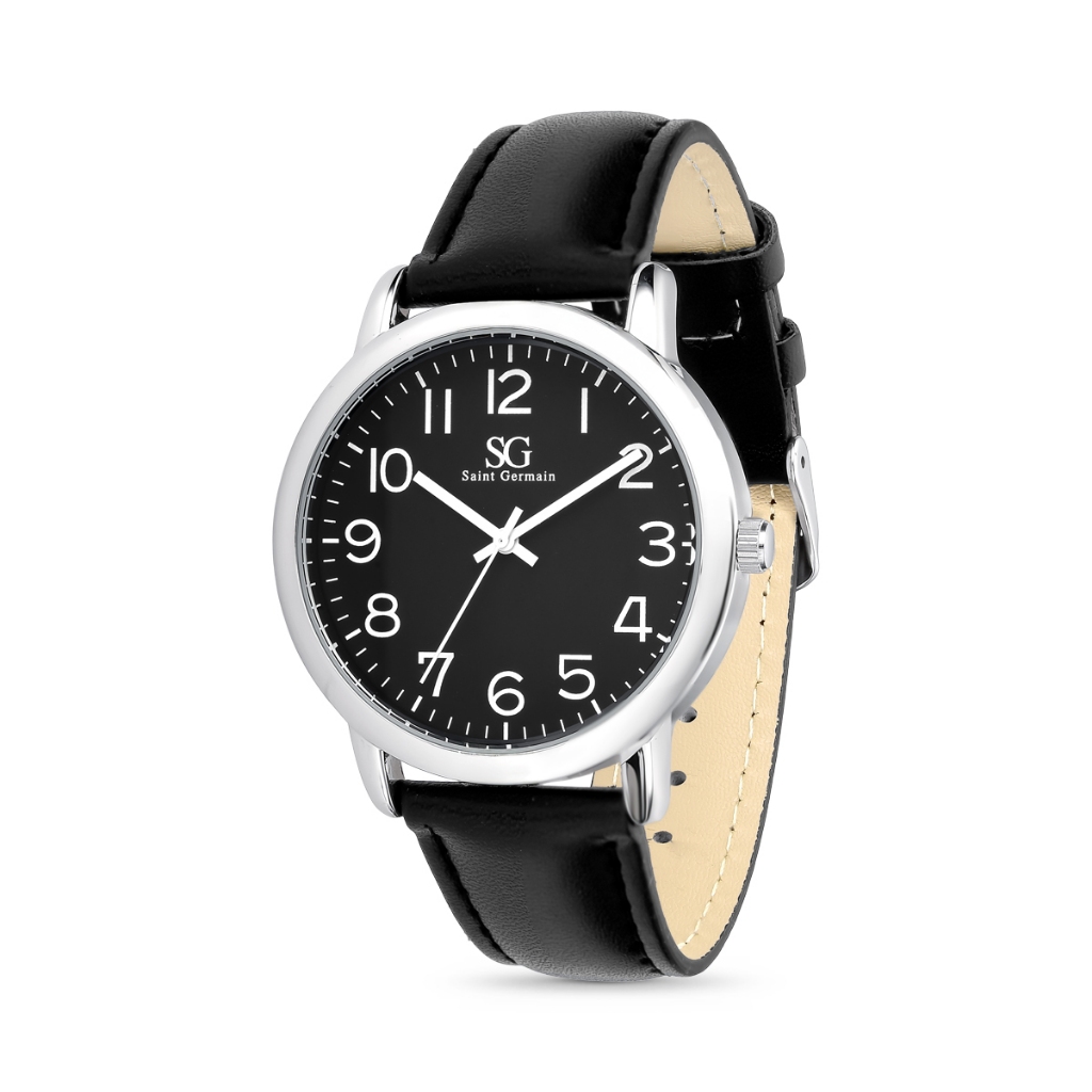 Relógio Masculino Preto Couro com Caixa Prata Fundo Preto Saint Germain Elegante Clássico