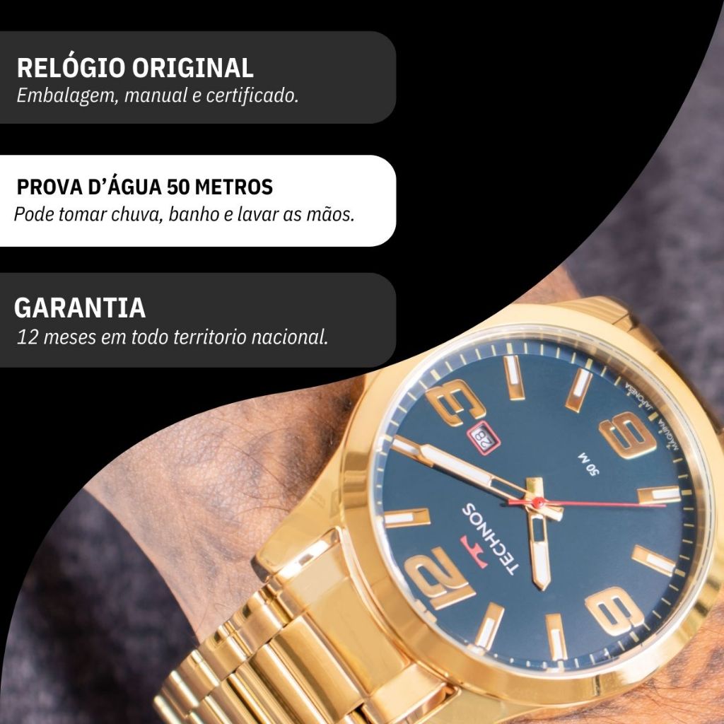 Relógio masculino Technos analógico dourado, à prova d'água, original, perfeito para presente. Modelo 2115MPIS/4A