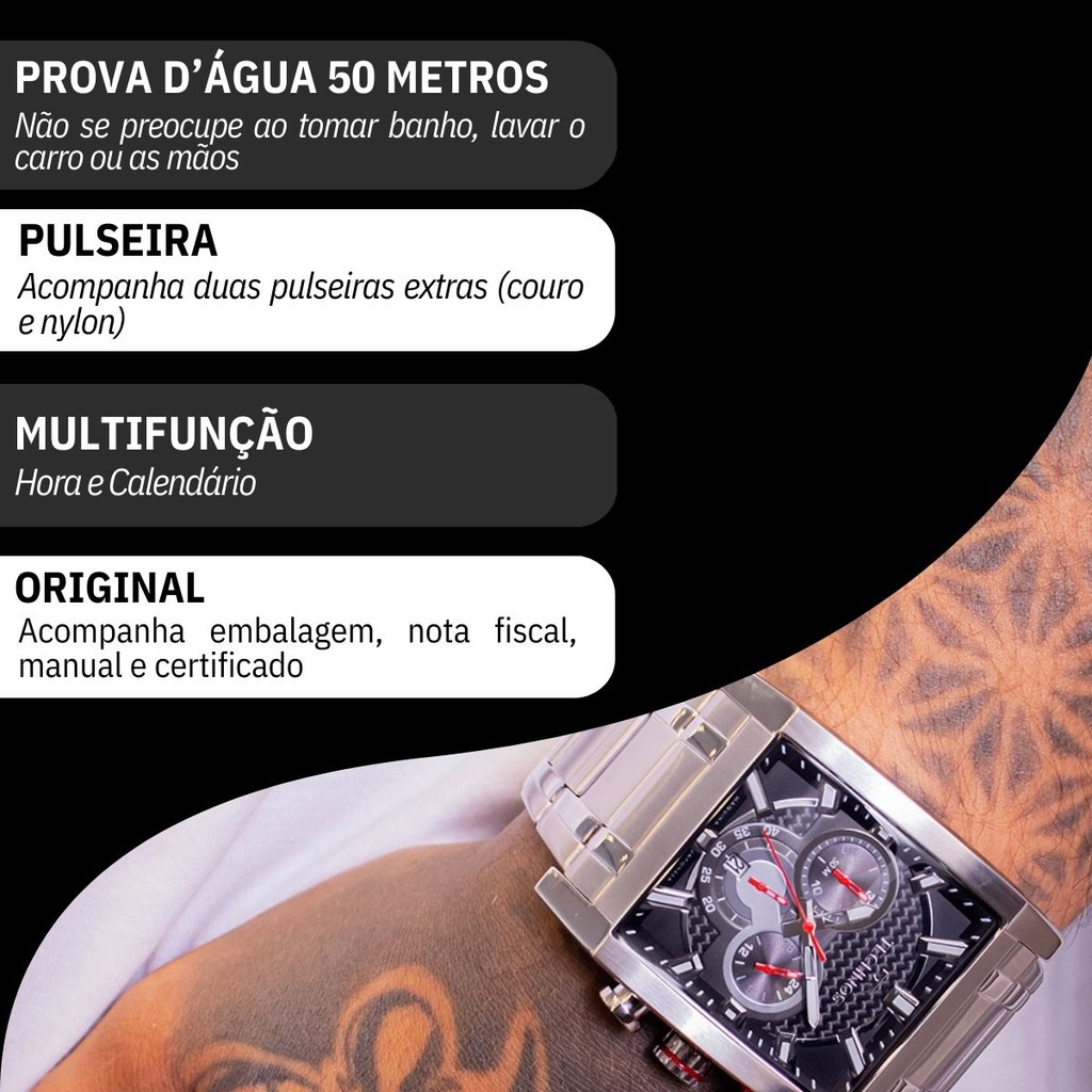 Você está procurando um relógio analógico masculino Technos para acompanhar o seu dia a dia? Seja bem vindo à RBM WEBSHOP - todos os nossos relogios são originais e a pronta entrega para envio imediato. Veja as PRINCIPAIS CARACTERÍSTICAS do Relógio Masculino Technos Informações Básicas Marca: Technos Modelo: JS25BBJ/T1P Gênero: Masculino Resistência à Água: 5atm – 50mts: Pode ser usado para nadar, praticar esportes e lavar as mãos Medidas do Relógio Tamanho (altura X largura): 6,0 X 4,1 cm (GRANDE) Circunferência da pulseira e tamanho máximo de ajuste de punho: 20 cm Espessura: 1,3 cm Largura da Pulseira: 2,5 cm Peso: 205 gramas Materiais do Relógio Composição do Vidro: Cristal Mineral (RESISTENTE A RISCOS) Material da Caixa: Aço Inox Material da Pulseira: Aço Inox Material da Tampa: Aço Inox Características do Relógio Mecanismo: Analógico Calibre: OS1A (Miyota) Precisão: - + 15 segundos por mês Alimentação: Bateria Duração aproximada da bateria: 3 anos Fecho: Fecho Dobrável com Botão e Trava (Folding Clasp with Push-Button and Safety) Tampa Posterior: Parafusado FUNÇÕES ESPECIAIS Cronógrafo de 60 minutos Visor de data Cores Mostrador: Preto Caixa: Prata Pulseira: Prata Garantia 1 ano de garantia em todo território nacional com a rede autorizada Conteúdo da Embalagem Este produto acompanha Manual em Português e Nota Fiscal, 2 pulseiras extras (1 nylon, 1 borracha) . Embalagem de Fabrica Original e Garantia Nacional do Fabricante. VAMOS CONHECER MELHOR SOBRE A LOJA RBM WEBSHOP RELOGIOS? Somos uma das melhores e maiores lojas de relogios no Brasil. Todos os relógios vendidos pela nossa loja são 100% originais, contém nota fiscal, certificado, manual de instruções e garantia de 12 meses com a rede de assistência em todo o Brasil. Dúvidas? Pergunte, e será um enorme prazer lhe atender!