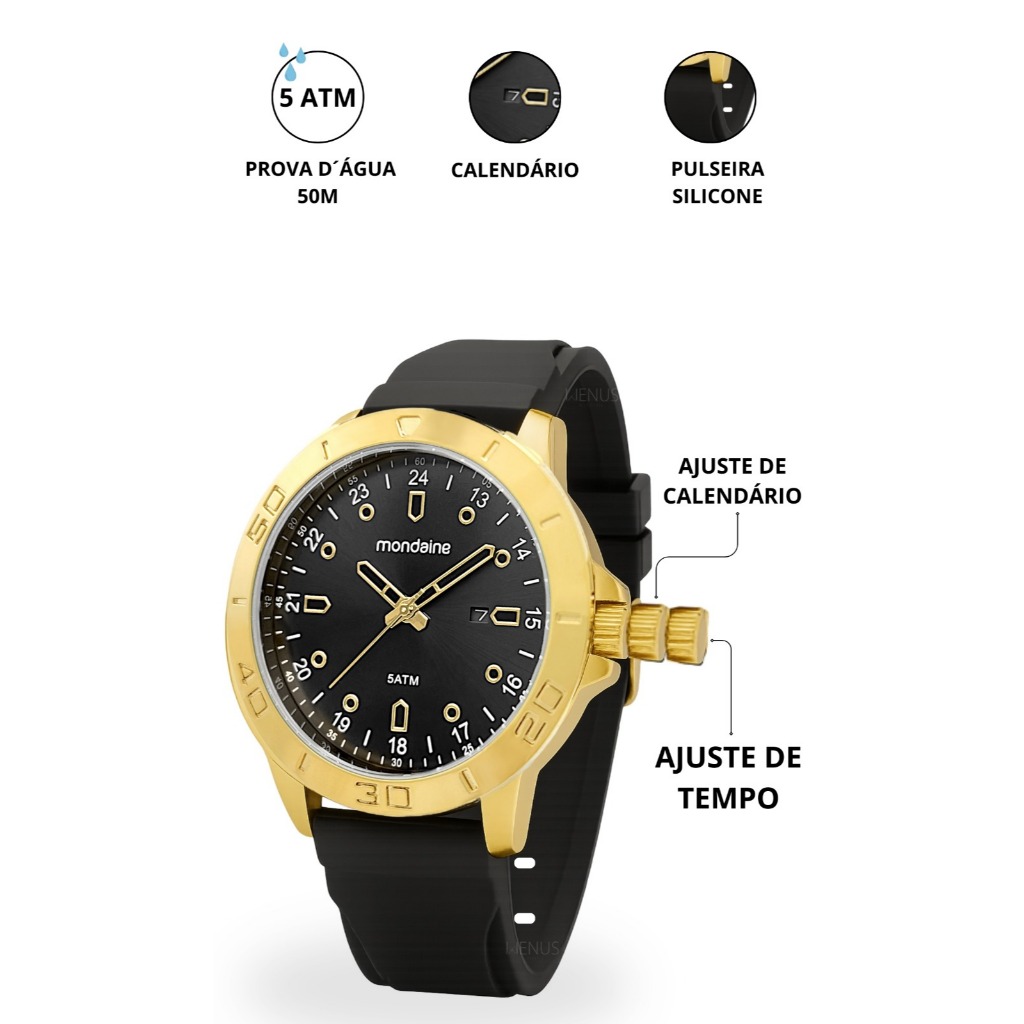 Este relógio une design arrojado e funcionalidade para o dia a dia. Com visor preto, caixa dourada e numeração diferenciada, o modelo chama atenção pelo visual moderno e imponente. A pulseira em silicone resistente com fecho por fivela garante conforto e praticidade em qualquer ocasião. Com função analógica e calendário, é a escolha ideal para quem busca esportividade com estilo. Especificações do Relógio: Marca: Mondaine; Modelo do Relógio: 99624GPMVDI2; Gênero: Masculino. Recursos do Modelo: Possui Calendário com dias do mês(1-31). Informações do Modelo: Mecanismo: Quartz; Cor da Caixa: Dourado; Cor do Bisel: Dourado; Cor da Pulseira: Preto; Cor do Mostrador: Preto; Material da Caixa: Metal; Material da Pulseira: Silicone; Material do Vidro do Mostrador: Cristal Mineral; Tipo de Fecho do modelo: Fivela Simples. Medidas do Modelo: Espessura Caixa: 10.6mm; Diâmetro Caixa Com a Coroa: 51.2mm; Diâmetro Caixa Sem a Coroa: 47.8mm; Diâmetro Visor: 38.5mm; Largura Pulseira: 20.4mm; Largura Pulseira Base: 21.8mm; Circunferência da Pulseira: 20cm; Circunferência Pulseira com a caixa: 26cm; Peso sem a embalagem: 84g; Peso da caixa com relógio: 227g; Fundo do relógio: Rosqueado. Conteúdo da Embalagem: 1 Relógio Mondaine Original; 1 Certificado de Garantia de Fábrica (1 ano); 1 Caixa Original Mondaine. Resistência à Água - 5 ATM: Adequados para natação se não existir grandes alterações de temperatura. Não aptos para mergulho nem mergulho com ar comprimido. Atenção e Cuidados: Não usar o relógio durante o banho, pois os produtos que são utilizados durante o banho podem comprometer a vedação e a qualidade do seu relógio. Certifique-se de que a coroa está totalmente encaixada antes do contato com a água. Nunca pressione botões ou ajuste a coroa enquanto o relógio estiver molhado ou submerso. Após exposição à água salgada, enxágue o relógio em água doce e seque-o completamente. Não exponha o relógio à água quente ou morna, pois isso pode afetar a vedação e reduzir sua resistência à água. Perguntas Frequentes: Somos a Loja Oficial da Relojoaria Wenus. Tamanho: Grande. Produto: Original. Acompanha Nota Fiscal. Pronta Entrega Disponível. Não possui efeito fosforescente nem visor noturno. Não Possui Catraca Giratória. Nossos Clientes contam com uma equipe de especialistas altamente qualificados para atender todas as suas necessidades. Frete grátis podendo ter alteração de acordo com a região. Garanta já o seu e leve para o pulso um acessório que combina estilo, praticidade e personalidade. Perfeito para quem não abre mão de se destacar com um visual esportivo e marcante!