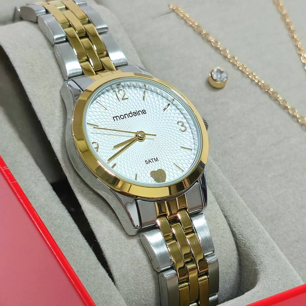 SOBRE A EMPRESA: Somos a Relógios Campana, uma empresa especializada em vendas online, revendedora autorizada das maiores marcas do mercado. Trabalhamos apenas com produtos originais e com garantia de fábrica. Comprando conosco você tem a segurança que receberá seu produto nas seguintes condições: => REVENDEDOR AUTORIZADO => PRODUTO ORIGINAL => GARANTIA DO FABRICANTE => PRODUTO NOVO => EMBALAGEM ORIGINAL DO PRODUTO => MANUAL DE INSTRUÇÕES => CERTIFICADO DE GARANTIA => NOTA FISCAL => PRODUTOS A PRONTA-ENTREGA SOBRE O PRODUTO: Encantador kit composto por um relógio analógico com caixa pequena, marcadores numéricos e geométricos, além de uma textura sofisticada no mostrador e detalhe delicado de coração. Este conjunto acompanha um lindo colar com pingente de cristal e brinco ponto de luz, adicionando um toque de elegância e estilo ao seu visual. Ideal para presentear ou para uso pessoal, este kit combina funcionalidade com beleza, destacando-se em qualquer ocasião. Especificações: Marca: MondaineModelo: 32795LPMKBE3K1 Gênero: Feminino Cor da caixa: Prata/Dourado Cor da pulseira: Prata/DouradoCor do mostrador: Branco Estilo: Clássico Alarme: Não Calendário: Não Cronômetro: Não Luz: Não Resistência à água: Sim = rotinas diárias Tipo de fecho: Dobrável com trava lateral Material da caixa: Aço inoxidável Material da pulseira: Aço inoxidável Características do vidro: Vidro Mineral Lug To Lug: 35 mm Tamanho da caixa (A x L): 28 x 28 mm Espessura da caixa: 8 mm Comprimento da pulseira: 20 cm Largura da pulseira: 12 mm Tampa do fundo: Rosqueado Peso: 35 Gramas Alimentação: Bateria Conteúdo da Embalagem: Relógio, nota fiscal, certificado garantia e manual de instruções Garantia do Fabricante: 12 meses Fabricante: Mondaine