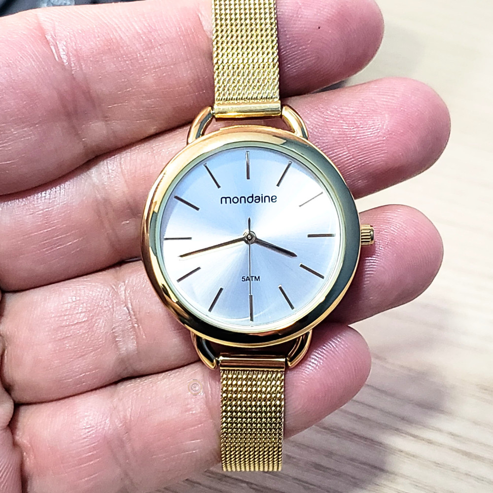 SOBRE A EMPRESA: Somos Relógios Campana, uma empresa especializada em vendas online, revendedora autorizada das maiores marcas do mercado. Trabalhamos apenas com relógios originais com garantia de fábrica. Comprando conosco você tem a segurança que receberá seu produto nas seguintes condições: => REVENDEDOR AUTORIZADO => PRODUTO ORIGINAL => GARANTIA DO FABRICANTE => PRODUTO NOVO => EMBALAGEM ORIGINAL DO PRODUTO => MANUAL DE INSTRUÇÕES => CERTIFICADO DE GARANTIA => NOTA FISCAL => RELÓGIO A PRONTA-ENTREGA SOBRE O PRODUTO: O design minimalista deste relógio expressa pura elegância. Ele possui visor prateado com marcadores simples que contrasta levemente com a folheação dourada que o cobre. A pulseira é um charme a parte, feita de malha de aço com shape fino. É o modelo ideal para mulheres que optam por acessórios mais delicados. Especificações: Marca: Mondaine Modelo: 53612LPMVDE1 Tipo de relógio: Analógico Gênero: Feminino Cor da caixa: Dourado Cor da pulseira: Dourado Estilo: Casual Alarme: Não Cronômetro: Não Calendário: Não Luz: Não Resistência à água: Sim – 5 ATM = 50 metros Tipo de fecho: Fecho de Gancho Material da Caixa: Aço Material da Pulseira: Mesh de Aço Inoxidável Características do vidro: Cristal Mineral Tamanho da caixa: 32 mm Espessura da caixa: 9 mm Peso: 38 g Comprimento da pulseira: 22 cm Largura da pulseira: 9 mm Tampa do fundo: Rosqueado Alimentação: Bateria Conteúdo da Embalagem: Relógio, nota fiscal, certificado garantia e manual de instruções Garantia do Fabricante: 12 meses Fabricante: Seculus da Amazônia Indústria e Com S/A