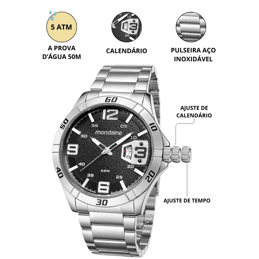 Relógio ideal para o homem que busca um estilo esportivo e casual para o dia a dia. Com caixa e pulseira em aço inoxidável, visor de cristal mineral e ponteiros analógicos, oferece durabilidade, precisão e design original, marca registrada da Mondaine. Resistente à água, é perfeito para diversas ocasiões. Informações do Relógio: Marca: Mondaine; Modelo: 53834G0MVNE1; Gênero: Masculino. Recursos do Modelo: Possui Calendário com dias do mês(1-31); Possui efeito Fosforescente presente em seus ponteiros e marcadores. Características do Modelo: Mecanismo: Quartz; Cor da Caixa: Prateado; Cor da Pulseira: Pratado; Material da Caixa: Aço Inoxidável; Material da Pulseira: Metal; Material do Vidro: Cristal Mineral; Tipo de Fecho: Dobrável com trava; Alimentação: Bateria. Medidas do modeo: Espessura Caixa: 9,3mm (0,9cm); Diâmetro Caixa: 51,00mm (5,1cm); Diâmetro Visor: 36,1mm (3,6cm); Largura Pulseira: 19,7mm (1,9cm); Largura Pulseira Base: 21,5mm (2,1cm); Circunferência da Pulseira: 210mm (21cm); Circunferência Pulseira com a caixa: 255mm (25,5cm); Peso sem a embalagem: 111g; Fundo do relógio: Rosqueado. Conteúdo da Embalagem: 1 Relógio Mondaine Original; 1 Certificado de Garantia de 1 ano de fabrica; 1 Caixa de original da marca Mondaine. Prova D'água 50 Metros - 5 ATM: Adequados para natação se não existir grandes alterações de temperatura. Não aptos para mergulho nem mergulho com ar comprimido. Atenção e Cuidados: Não usar o relógio durante o banho, pois os produtos que são utilizados durante o banho podem comprometer a vedação e a qualidade do seu relógio. Certifique-se de que a coroa está totalmente encaixada antes do contato com a água. Nunca pressione botões ou ajuste a coroa enquanto o relógio estiver molhado ou submerso. Após exposição à água salgada, enxágue o relógio em água doce e seque-o completamente. Não exponha o relógio à água quente ou morna, pois isso pode afetar a vedação e reduzir sua resistência à água. Perguntas Frequentes: Somos a Loja Oficial da Relojoaria Wenus. Tamanho: Grande. Produto: Original. Acompanha Nota Fiscal. Pronta Entrega Disponível. Não Possui Catraca Giratória. Para uma visualização imediata do efeito fosforescente, posicione uma luz diretamente sobre o mostrador por cerca de 10 segundos. Depois, leve o relógio para um ambiente escuro e veja os ponteiros e marcadores brilharem. Nossos Clientes contam com uma equipe de especialistas altamente qualificados para atender todas as suas necessidades. Sobre a Empresa: Nós da relojoaria Wênus, buscamos entregar a nossos clientes produtos de qualidade garantida, sem abrir mão de estilo e sofisticação. Vendemos muito mais do que relógios, vendemos acessórios de estilo que possibilita expressar personalidade, agregando valor e comunicando de forma sutil elegância e atitude. Trabalhamos a mais de 40 anos no ramo de relógios, nosso atendimento é focado na satisfação de nossos clientes. Devido ao bom atendimento e as vendas realizadas com excelência, hoje temos orgulho de informar que fomos qualificados pelo Mercado Livre com o título de Mercado Líder PLATINUM, o que significa que estamos entre os melhores vendedores da plataforma Seja bem-vindo (a) a Wênus Relojoaria! Aguardamos a sua compra