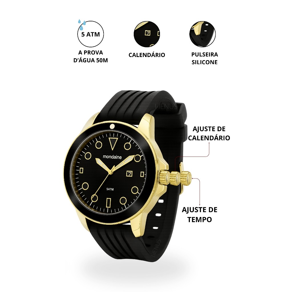 Com design super moderno, este relógio se destaca pelo contraste elegante entre o visor preto e a caixa metálica dourada. Seu mostrador analógico com calendário garante praticidade no dia a dia, enquanto a pulseira em silicone preto, com acabamento texturizado e fecho por fivela, proporciona conforto e estilo para todas as ocasiões. Especificações do Relógio: Modelo Referência: 99623GPMVDI2; Gênero: Masculino; Cor da Caixa: Dourado; Cor da Pulseira: Preto; Cor do Mostrador: Preto; Cor do Bisel: Preto; Material da Pulseira: Silicone; Material da Caixa: Metal; Tipo do Vidro: Cristal Mineral; Fecho: Fivela Simples. Dimensões: Espessura Caixa: 11.4mm; Diâmetro Caixa Com a Coroa: 51.9mm; Diâmetro Caixa Sem a Coroa: 47.8mm; Diâmetro Visor: 38.7mm; Largura Pulseira: 21.3mm; Largura Pulseira Base: 21.3mm; Circunferência da Pulseira: 19cm; Circunferência Pulseira com a caixa: 26cm; Peso sem a embalagem: 91g; Peso da caixa com relógio: 240g; Fundo do relógio: Rosqueado. Conteúdo da Embalagem: 1 Relógio Mondaine Original; 1 Certificado de Garantia de Fábrica (1 ano); 1 Caixa Original Mondaine. Perguntas Frequentes: Somos a Loja Oficial da Relojoaria Wenus; Acompanha Nota Fiscal; Pronta Entrega Disponível; Não Possui Catraca Giratória; Possui Calendário com dias do mês (1-31); Possui Efeito fosforescentes presentes em seus ponteiros (Hora e Muito); Nossos Clientes contam com uma equipe de especialistas altamente qualificados para atender todas as suas necessidades. Resistência à Água - 5 ATM: Adequados para natação se não existir grandes alterações de temperatura. Não aptos para mergulho nem mergulho com ar comprimido. Atenção e Cuidados Não usar o relógio durante o banho, pois os produtos que são utilizados durante o banho podem comprometer a vedação do seu relógio. Certifique-se de que a coroa está totalmente encaixada antes do contato com a água. Nunca pressione botões ou ajuste a coroa enquanto o relógio estiver molhado ou em contato com à água. Após exposição à água salgada, enxágue o relógio em água doce e seque-o completamente. Não exponha o relógio à água quente ou morna, pois isso pode afetar a vedação e reduzir sua resistência à água. Se você busca um acessório que una modernidade, sofisticação e conforto, este relógio é a escolha ideal. Perfeito para compor looks casuais ou dar um toque arrojado ao visual, ele se adapta ao seu estilo com personalidade. Garanta já o seu e destaque-se em cada momento!