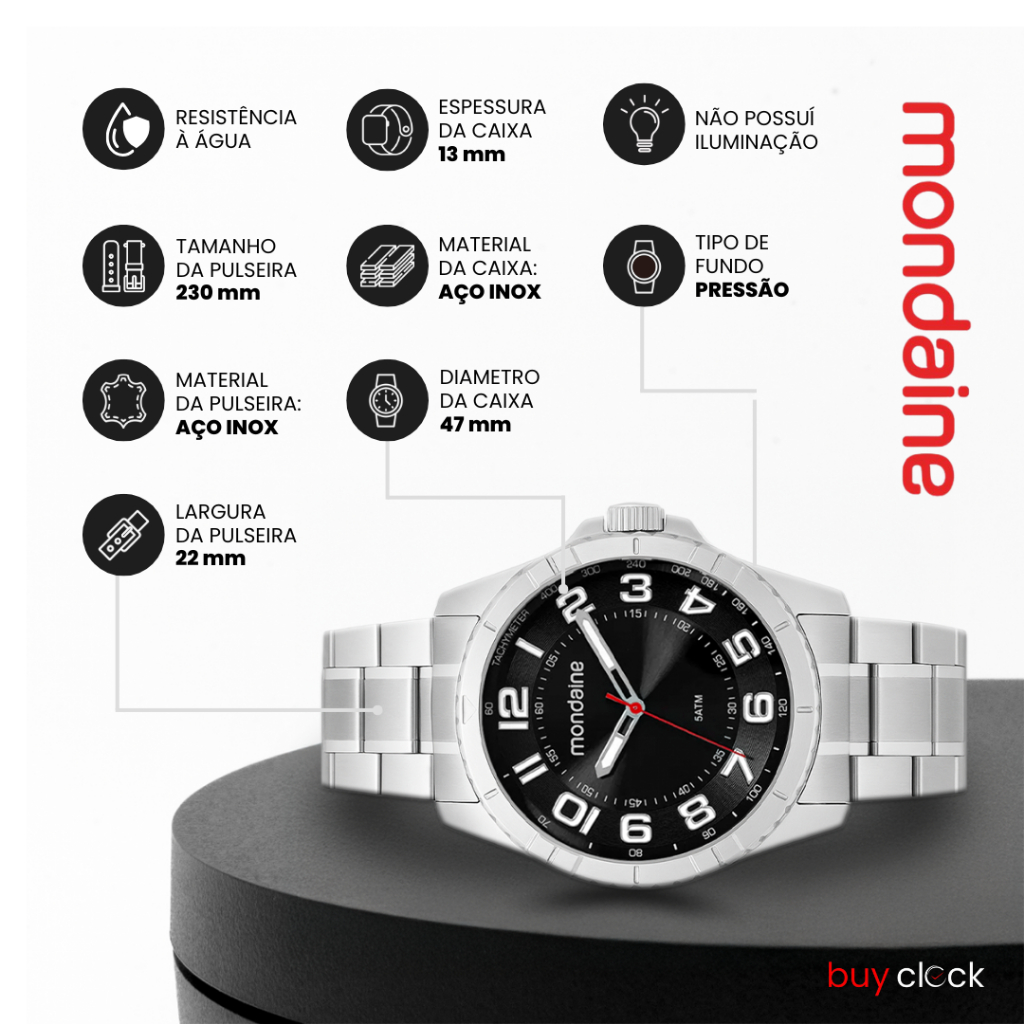 CARO CLIENTE: [O RELOGIO PODE VIR COM UMA TRAVA DE SEGURANÇA (UM PLASTICO BRANCO, VERMELHO ou TRANSPARENTE) NA COROA. PARA ATIVAR O RELOGIO, A TRAVA DE SEGURANÇA DEVE SER RETIRADA.] [POR MAIS QUE O RELÓGIO SEJA RESISTENTE A ÁGUA, NÃO RECOMENDAMOS BANHOS OU MERGULHOS COM ELE, POIS MESMO RELÓGIOS COM RESISTÊNCIA A ÁGUA PODEM SOFRER DANOS SE FOREM EXPOSTOS A PRESSÕES OU TEMPERATURAS EXTREMAS DE ÁGUA E SAL OU CLORO.] [PARA ACIONAR A GARANTIA ENTRAR EM CONTATO DIRETAMENTE COM O FABRICANTE.] NO CASO DE DUVIDAS ESTAMOS À DISPOSIÇÃO, ATENCIOSAMENTE, BUY CLOCK. __________________________ 1. Informações Básicas: Marca: Mondaine Modelo: 32638G0MVNE2 Gênero: Masculino Resistencia a Água: 5 ATM / 50 Metros Garantia: 12 meses diretamente com o fabricante Funções Especiais: __________________________ 2. Características Técnicas: Material da Caixa: Aço Inoxidável Prata Material da Pulseira: Aço Inoxidável Prata Modelo: Analógico Alimentação: Quartz/Bateria Vidro: Cristal mineral Formato: Redondo Mostrador: Preto Fundo: Rosqueado Tipo de Fecho: Dobrável __________________________ 3. Medidas e Peso: Diâmetro da Caixa: 48 mm (considerado médio) Espessura da Caixa: 15 mm Diâmetro do Visor: 43 mm Largura da Base da Pulseira: 35 mm Largura da Pulseira: 24 mm Circunferência da Pulseira: 185 mm Circunferência da Pulseira com a Caixa: 245 mm Peso: 133 gramas __________________________ 5. Acompanha: Certificado de garantia | Manual de instrução | Caixa do relógio