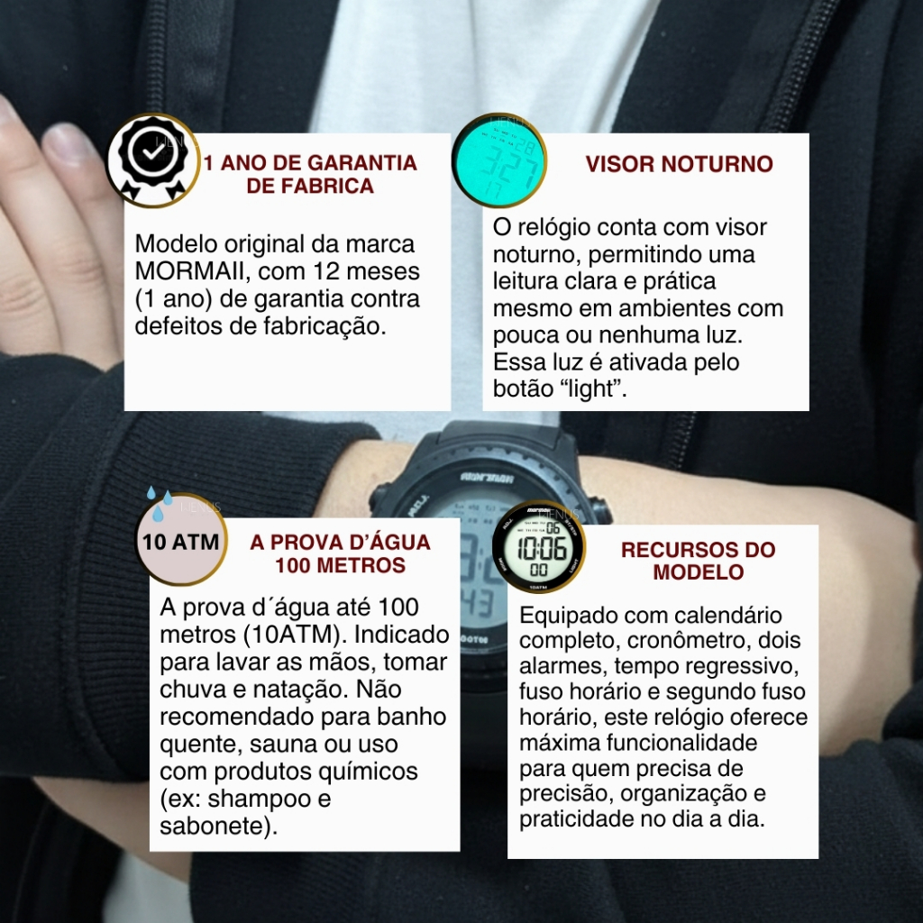 Para seus filhos, o relógio Mormaii digital é a escolha ideal para acompanhar o dia a dia das crianças com resistência, conforto e praticidade. Desenvolvido para o uso infantil, ele possui leitura fácil, design esportivo e excelente durabilidade, sendo perfeito para a escola, momentos de lazer e atividades do cotidiano. Recursos que do Modelo: Calendário completo. Cronometro. 2 Alarmes. Tempo Regressivo. Fuso Horário. Segundo Fuso Horário Informações do Modelo: Fabricante: Mormaii. Modelo do Relógio: MOLCDAAY. Gênero: Unissex. Mecanismo: Digital. Cor da Caixa: Preto. Cor do Bisel: Preto. Cor da Pulseira: Preto. Cor do Mostrador: LCD Positivo. Material da Caixa: Polímero. Material da Pulseira: Polímero. Material do Vidro do Mostrador: Resina. Tipo de Fecho do modelo: Fivela Simples. Medidas do Modelo: Espessura Caixa:11.1 mm. Diâmetro da Caixa: 35.4mm. Diâmetro Visor: 28mm. Largura Pulseira: 17.5mm. Largura Pulseira Base: 17.8mm. Circunferência da Pulseira: 19.5cm. Circunferência Pulseira com a caixa: 24cm. Peso sem a embalagem: 34g. Peso da caixa com relógio: 124g. Fundo do relógio: Parafusado. Conteúdo da Embalagem: 1 Relógio Mormaii Original. 1 Certificado de Garantia de Fábrica (1 ano). 1 Caixa Original Mormaii. PROVA D’ÁGUA - 10 ATM: Adequado para a maioria dos esportes aquáticos como a vela, o mergulho e a natação em águas pouco profundas. Não adequado para mergulho com ar comprimido. Atenção e Cuidados: Não usar o relógio durante o banho, pois os produtos que são utilizados durante o banho podem comprometer a vedação e a qualidade do seu relógio. Certifique-se de que a coroa está totalmente encaixada antes do contato com a água. Nunca pressione botões ou ajuste a coroa enquanto o relógio estiver molhado ou submerso. Após exposição à água salgada, enxágue o relógio em água doce e seque-o completamente. Não exponha o relógio à água quente ou morna, pois isso pode afetar a vedação e reduzir sua resistência à água. Perguntas Frequentes: Somos a Loja Oficial da Relojoaria Wênus. Tamanho: Pequeno. Produto: Original. Acompanha Nota Fiscal. Pronta Entrega Disponível. Um relógio pensado para crianças ativas, que oferece a segurança e a tranquilidade que os pais procuram, com a qualidade e confiabilidade da marca Mormaii. Garantia de fábrica: 12 meses