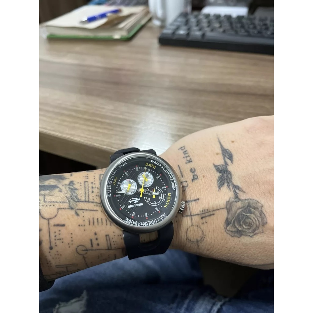 Relógio Mormaii Masculino Pro Prata - MO6P05/8P O Relógio Mormaii PRO chegou com a presença do maquinismo multifunção no mostrador super detalhado. Ele possui uma caixa de aço de 42mm e pulseira de silicone preta, para aguentarem firme qualquer mergulho, já que a linha possui a incrível resistência à água de até 200 metros. Melhor custo benefício para um relógio apropriado para mergulho, com resistência à água de 200 m / 20 atm e com toda a experiência e segurança de anos da Mormaii quando trata-se de esportes aquáticos. Relógio Mormaii Pró Modelo MO6P05/8P Gênero: Masculino Coleção Pró 2024 Tamanho: Padrão Funções - Analógico Multifunção - Calendário Características - Bateria - Coroa: Simples - Tampa posterior : Parafusada - Vidro: Cristal Mineral - Resistência à água : 200M ou 20 atm - Mostrador Preto com detalhes coloridos - Material da caixa: Aço Inoxidável - Material da pulseira: Silicone Preto EVITE ÁGUA QUENTE, VAPOR, PRODUTOS QUÍMICOS, POIS SÃO FATORES QUE PODEM DANIFICAR E/OU DIMINUIR A VIDA ÚTIL DE PARTES E PEÇAS DO RELÓGIO. LEIA O MANUAL DO FABRICANTE E SIGA AS ORIENTAÇÕES DE USO E CUIDADOS RECOMENDADOS. Medidas - Diâmetro da caixa : 4,2 cm - Diâmetro do visor : 3,8 cm - Espessura da caixa : 1,4 cm TAMANHO MÉDIO PARA O PADRÃO MASCULINO! NÃO É UM RELÓGIO COM CAIXA GRANDE ROBUSTA! Funções - Analógico Multifunção - Calendário Características - Bateria - Coroa: Simples - Tampa posterior : Parafusada - Vidro: Cristal Mineral - Resistência à água : 200M ou 20 atm - Mostrador Preto com detalhes prateado - Material da caixa: Aço - Material da pulseira: Silicone Preto Medidas - Diâmetro da caixa : 4,2 cm - Diâmetro do visor : 3,8 cm - Espessura da caixa : 1,4 cm