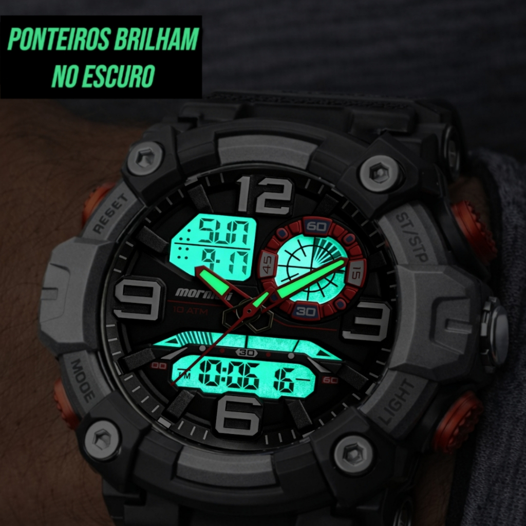 Aprovado em testes de padrão militar, ele entrega alta resistência e confiabilidade para encarar rotinas intensas e desafios do dia a dia. Seu design marcante combina mostrador analógico e digital, com detalhes em vermelho que reforçam a personalidade do modelo e garantem leitura fácil mesmo em movimento. Ideal para quem exige desempenho, ele transmite força, modernidade e confiança logo no primeiro olhar. Recursos do Modelo: Visor Noturno na cor verde. Calendário Completo. Cronógrafo. Tempo Regressivo. Alarme. Certificado MIL-STD 810H de Aprovado em Teste Militar. Informações do Modelo: Fabricante: Mormaii. Linha: Force. Modelo do Relógio: MO23843-8K. Gênero: Masculino. Mecanismo: Quartzo e Digital. Cor da Caixa: Preto. Cor do Bisel: Cinza. Cor da Pulseira: Preto. Cor do Mostrador: Preto e LCD Positivo. Material da Caixa: Polímero. Material da Pulseira: Polímero. Material do Vidro do Mostrador: Resina. Tipo de Fecho do modelo: Fivela Simples. Medidas do Modelo: Espessura Caixa: 19.7mm. Diâmetro Caixa Com a Coroa: 54.5mm. Diâmetro Caixa Sem a Coroa: 53.1mm. Diâmetro Visor: 35.6mm. Largura Pulseira: 21.7mm. Largura Pulseira Base: 25.1mm. Circunferência da Pulseira: 18cm. Circunferência Pulseira com a caixa: 27,5cm. Circunferência Interna da pulseira com a caixa: 21,5cm. Peso sem a embalagem: 73g. Peso da caixa com relógio: 210g. Fundo do relógio: Parafusado. Conteúdo da Embalagem: 1 Relógio Mormaii Original. 1 Certificado de Garantia de Fábrica (1 ano). 1 Caixa Original Mormaii Linha Force. Prova D'água - 10 ATM: Adequado para a maioria dos esportes aquáticos como a vela, o mergulho e a natação em águas pouco profundas. Não adequado para mergulho com ar comprimido. Atenção e Cuidados: Não usar o relógio durante o banho, pois os produtos que são utilizados durante o banho podem comprometer a vedação e a qualidade do seu relógio. Certifique-se de que a coroa está totalmente encaixada antes do contato com a água. Nunca pressione botões ou ajuste a coroa enquanto o relógio estiver molhado ou submerso. Após exposição à água salgada, enxágue o relógio em água doce e seque-o completamente. Não exponha o relógio à água quente ou morna, pois isso pode afetar a vedação e reduzir sua resistência à água. Perguntas Frequentes: Somos a Loja Oficial da Relojoaria Wênus. Tamanho: Grande. Produto: Original. Acompanha Nota Fiscal. Pronta Entrega Disponível. Nossos Clientes contam com uma equipe de especialistas altamente qualificados para atender todas as suas necessidades. Não perca a chance de ter um relógio que une resistência de padrão militar, design imbatível e funcionalidade para o seu estilo de vida ativo. Com ele, você estará pronto para qualquer desafio, seja no trabalho, na prática de esportes ou em aventuras. Garanta o seu agora e leve a sua confiança e desempenho a um novo nível. Garantia do vendedor: 12 meses