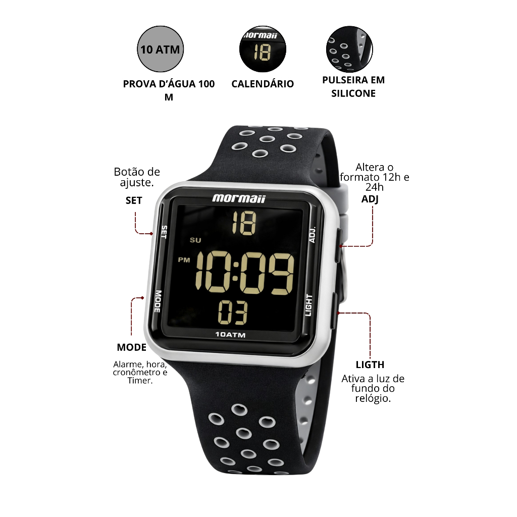 Seja para treinar, trabalhar ou viver a rotina com mais estilo, este relógio Mormaii foi feito para quem busca praticidade sem abrir mão do visual moderno. Com display LCD negativo digital clean, toque esportivo e resistência para encarar qualquer desafio, ele combina perfeitamente com todos os estilos do mais básico ao mais ativo. Um acessório versátil, confortável e pronto para te acompanhar em qualquer momento do dia. Recursos do Modelo: Calendário Completo. Cronômetro. Alarme. Contagem regressiva. Fuso horário. Informações do Modelo: Marca: Mormaii. Modelo do Relógio: MO6601-8K. Gênero: Feminino e Masculino (Unissex). Mecanismo: Digital. Cor da Caixa: Cinza. Cor do Bisel: Cinza. Cor da Pulseira: Preto. Cor do Mostrador: Material da Caixa: Polímero. Material da Pulseira: Silicone. Material do Vidro do Mostrador: Resina. Tipo de Fecho do modelo: Fivela Simples. Medidas do Modelo: Espessura Caixa: 12.3 mm. Altura da Caixa: 38.2mm. Largura da Caixa: 38mm. Altura do Visor: 32.9mm. Largura do Visor: 33.33mm. Largura Pulseira: 17.5mm. Largura Pulseira Base: 20.6 mm. Circunferência da Pulseira: 20.5cm. Circunferência Pulseira com a caixa: 25cm. Peso sem a embalagem: 43g. Peso da caixa com relógio: 135g. Fundo do relógio: Parafusado. Conteúdo da Embalagem: 1 Relógio Mormaii Original 1 Certificado de Garantia de Fábrica (1 ano) 1 Caixa Original Mormaii. PROVA D’ÁGUA - 10 ATM: Adequado para a maioria dos esportes aquáticos como a vela, o mergulho e a natação em águas pouco profundas. Não adequado para mergulho com ar comprimido. Atenção e Cuidados: Não usar o relógio durante o banho, pois os produtos que são utilizados durante o banho podem comprometer a vedação e a qualidade do seu relógio. Certifique-se de que a coroa está totalmente encaixada antes do contato com a água. Nunca pressione botões ou ajuste a coroa enquanto o relógio estiver molhado ou submerso. Após exposição à água salgada, enxágue o relógio em água doce e seque-o completamente. Não exponha o relógio à água quente ou morna, pois isso pode afetar a vedação e reduzir sua resistência à água. Perguntas Frequentes: Somos a Loja Oficial da Relojoaria Wênus. Tamanho: Médio. Produto: Original. Acompanha Nota Fiscal. Pronta Entrega Disponível. Nossos Clientes contam com uma equipe de especialistas altamente qualificados para atender todas as suas necessidades. Com um design que se adapta a qualquer estilo, resistência para o dia a dia e funções essenciais que facilitam sua rotina, este relógio Mormaii entrega muito mais do que apenas a hora: ele entrega praticidade, durabilidade e personalidade. Garantia de fábrica: 12 meses